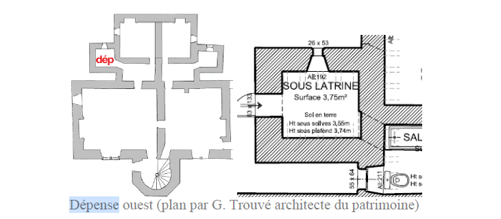 Aménagée au rez-de-chaussée du petit pavillon ouest, la dépense se situe au-dessous des latrines du premier étage. Pour les mêmes raisons que celles exposées au paragraphe relatif à la dépense Est, ce rez-de-chaussée n’a pas pu contenir de siège d’aisance : le conduit des latrines de l’étage ne peut pas servir en même temps au rez-de-chaussée : si l’on y pratiquait une ouverture, les odeurs reflueraient dans la pièce du bas. Et le conduit occupe toute la largeur du mur.