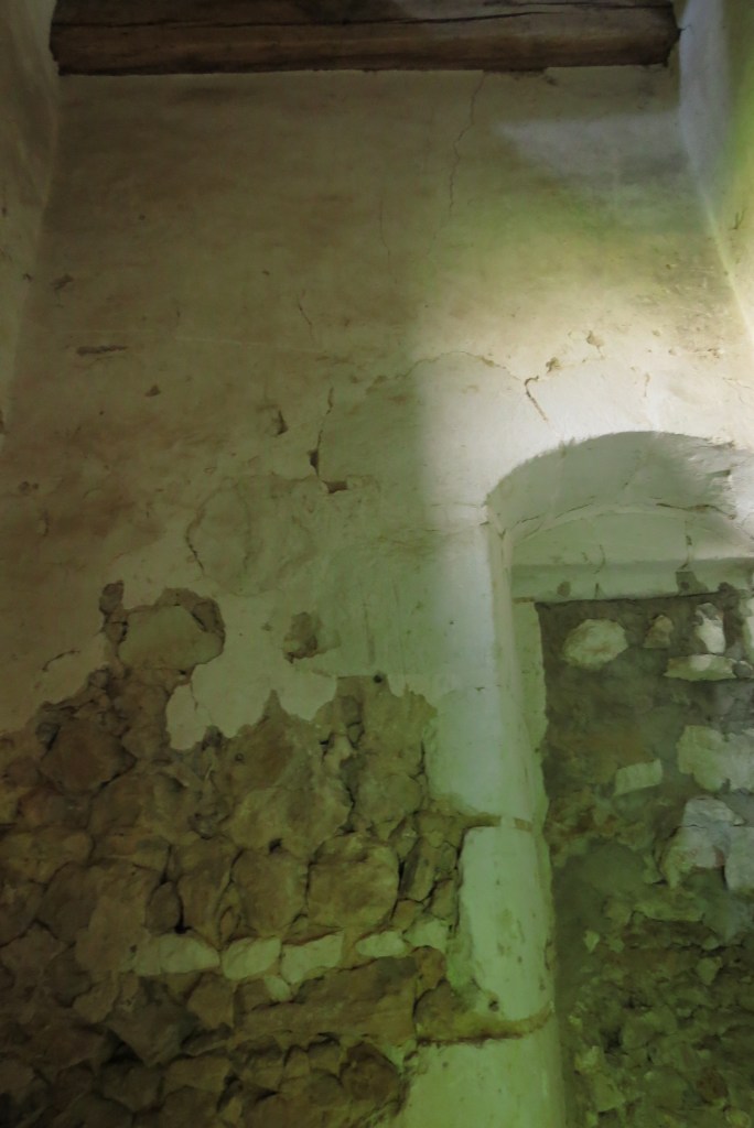 avec un enduit dégrossi non blanchi. Cet enduit se poursuit sur tout le mur ouest. Il s’agit du conduit d’une descente de latrines d’un pied de large sur toute la longueur que fait le mur ouest.
