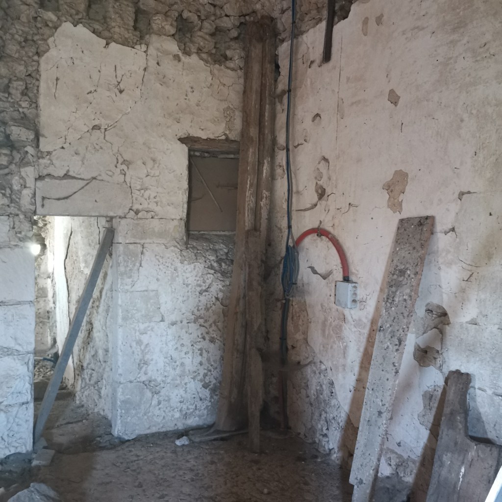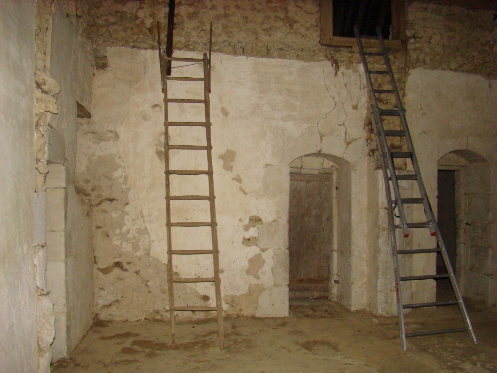 Le plancher supérieur a été démoli en même temps que les murs de refend, mais il laisse parfaitement visible les trous des solives et la lèvre supérieure de l’enduit des murs qui fait retour sur les entrevous