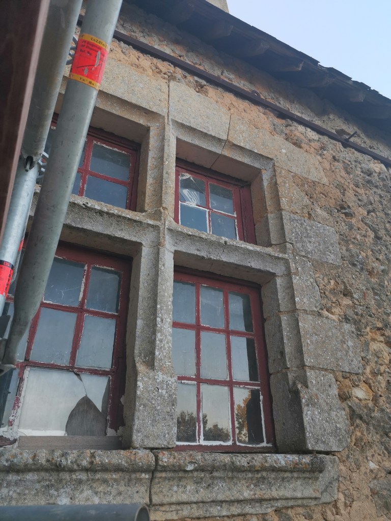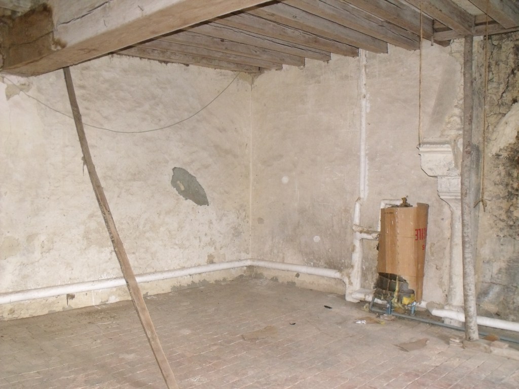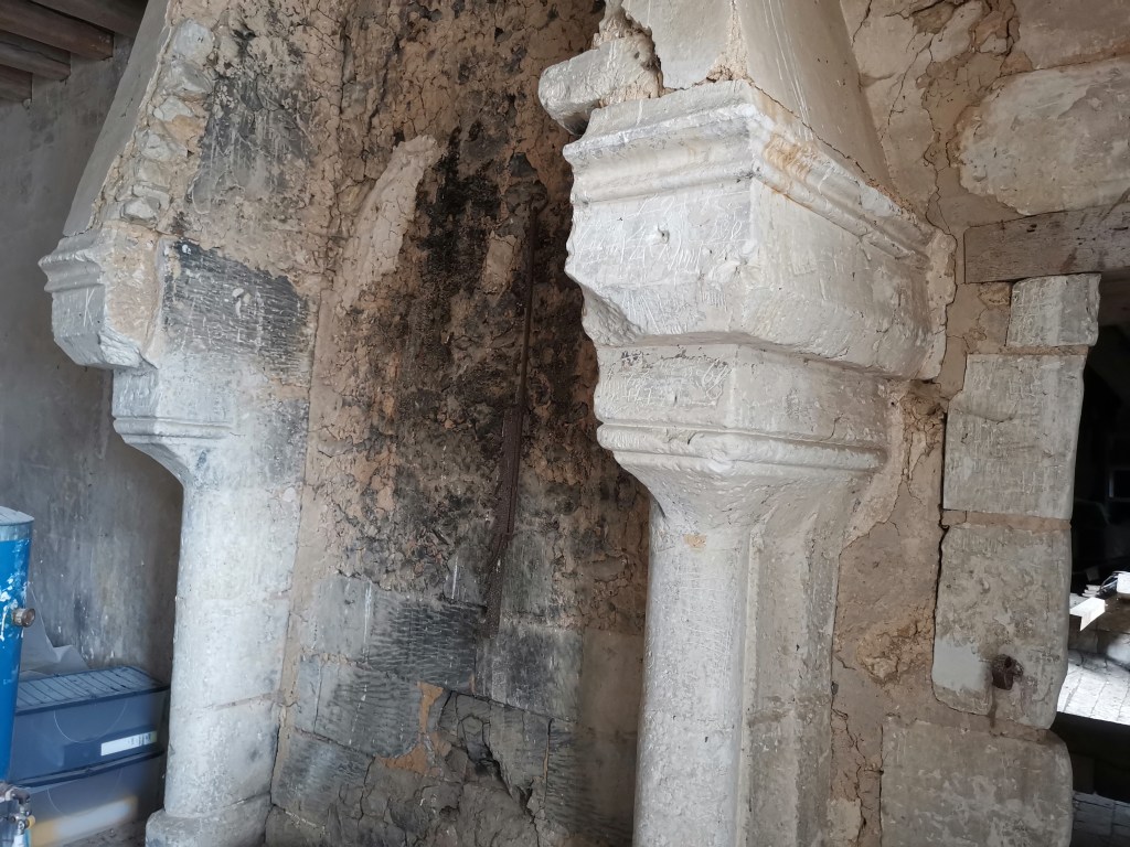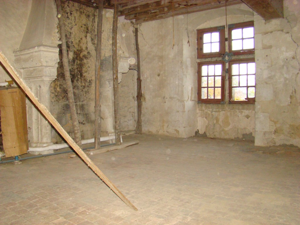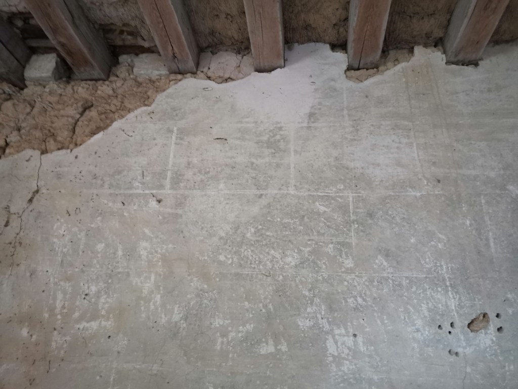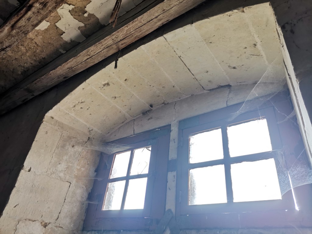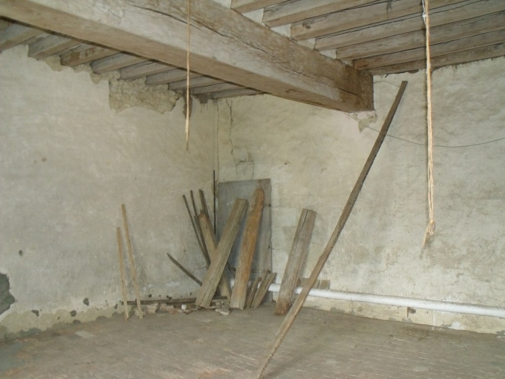 Toute une partie du mur, à l’Est de la poutre, a été renduite suite à des dégâts des eaux provenant de la noue de la toiture.