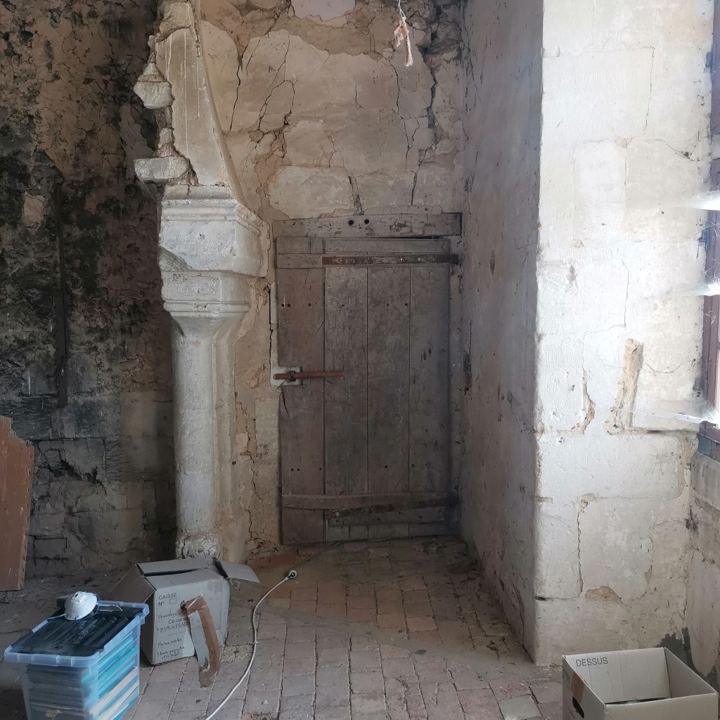 L’ouverture de la porte mesure 69 cm sur 1,70 m de haut. Elle se situe au plus près de l’angle formé par le mur de refend. Le cadre est entièrement en tuffeau, avec les arêtes chanfreinées et l’on voit encore le congé, en bas, même s’il est fort usé. Le vantail ancien a disparu.