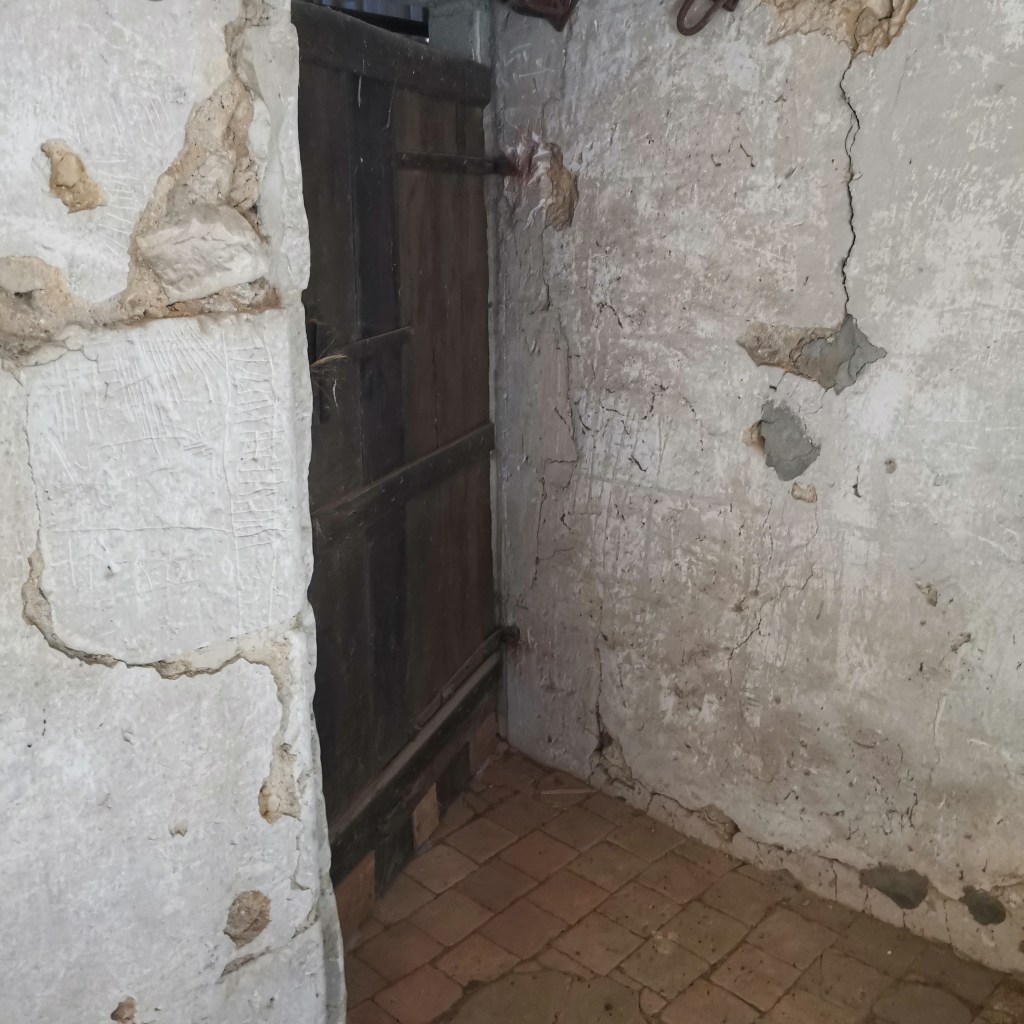 L’ouverture de la porte mesure 80 cm de large sur 1,80 m de haut, sur un seuil refait au XVIIIe siècle en bois et en pavés de 21 cm.