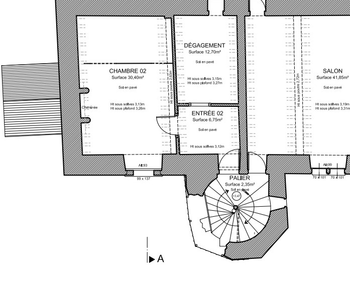 L’angle nord-est de la cage d’escalier a été élargi, c’est-à-dire que le « cercle » a été creusé pour dessiner un palier carré devant la porte de la chambre. Pour passer de ce carré au cercle de la cage d’escalier, l’architecte a fait construire un petit arc segmentaire appareillé en tuffeau.