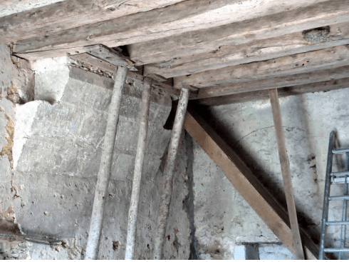Dans ce retour de mur il existe tout en haut un angle concave dans la maçonnerie comme si une pièce de bois y avait été placée lors de la construction et la maçonnerie faite autour.