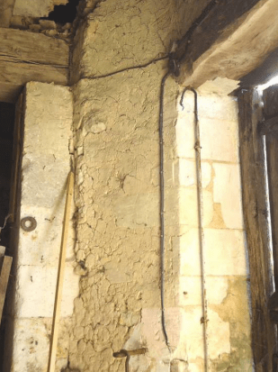 A distance de 106 cm de la joue Est de la poutre ouest se trouve la trace d’un mur en retour d’équerre qui a été démoli. L’angle est continu avec l’enduit du mur nord donc les deux étaient contemporains. Ce retour se prolonge plus haut derrière la solive qui longe le mur nord. Ce qui signifie que le plancher actuel est postérieur à l’existence de ce mur. Autrement dit ce mur a été démoli lorsqu’on a construit le plancher supérieur actuel.