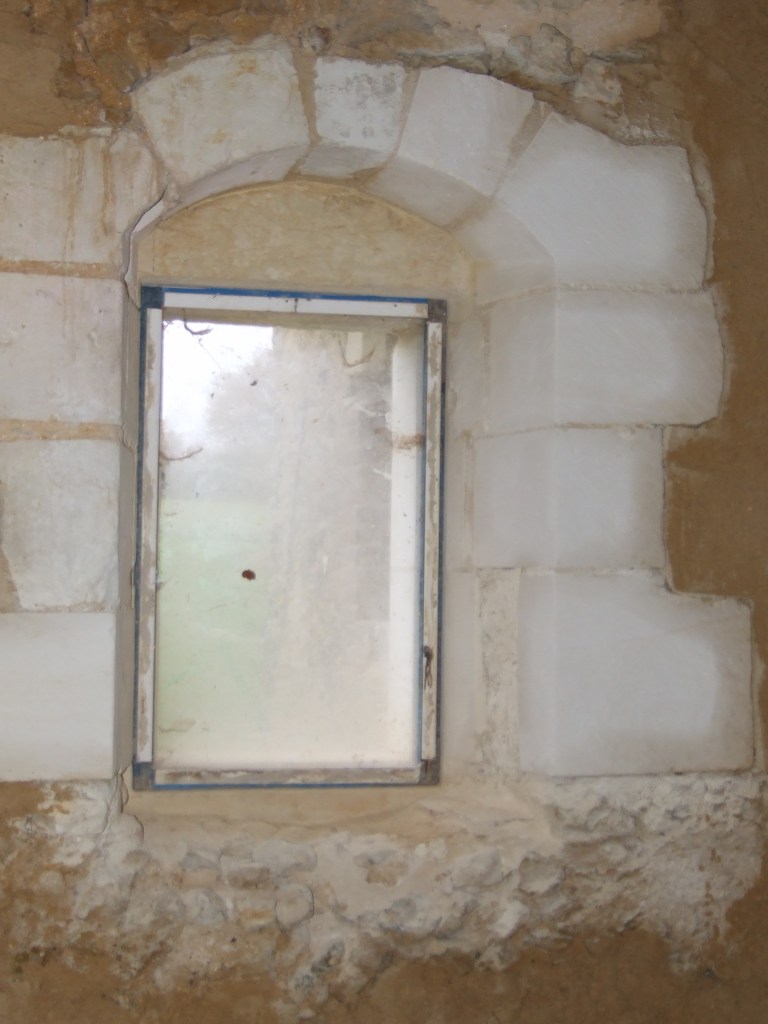 On y voit les traces de frottement du vantail, ce qui prouve qu’il n’existait pas de châssis dormant, mais seulement un ouvrant dans la feuillure de pierre.