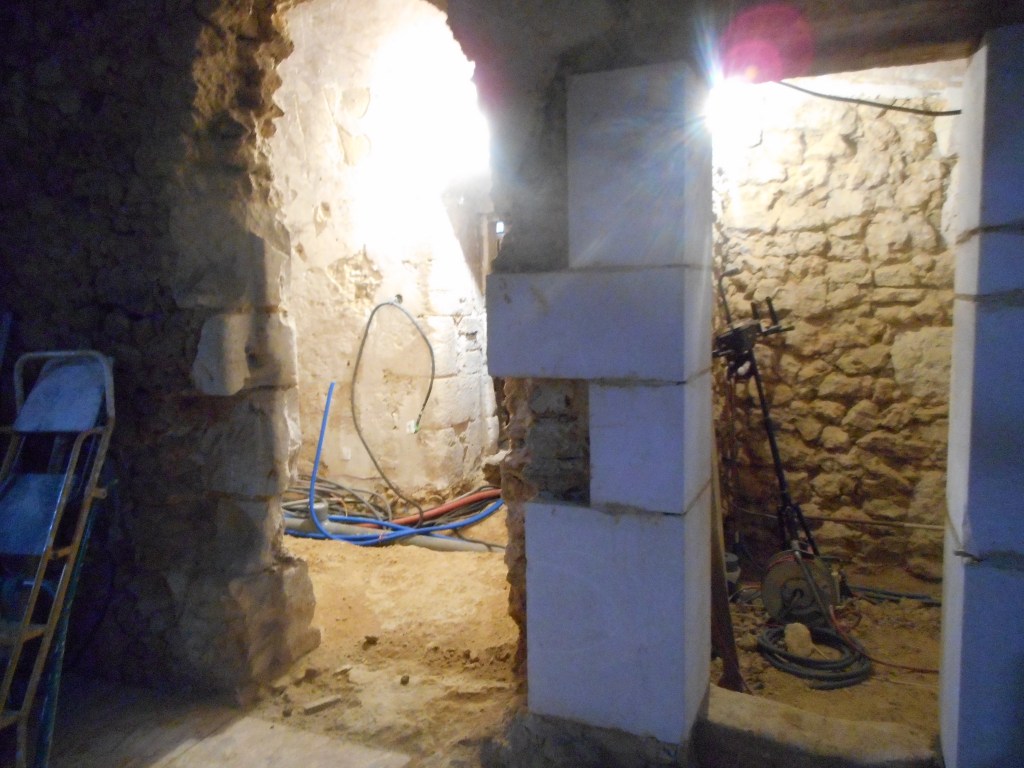 Le sol est enlevé sur plusieurs centimètres d’épaisseurs. On y découvre les vestiges de l’ancien mur de séparation entre les deux chambres, démoli lorsque les deux pièces ont été unifiées