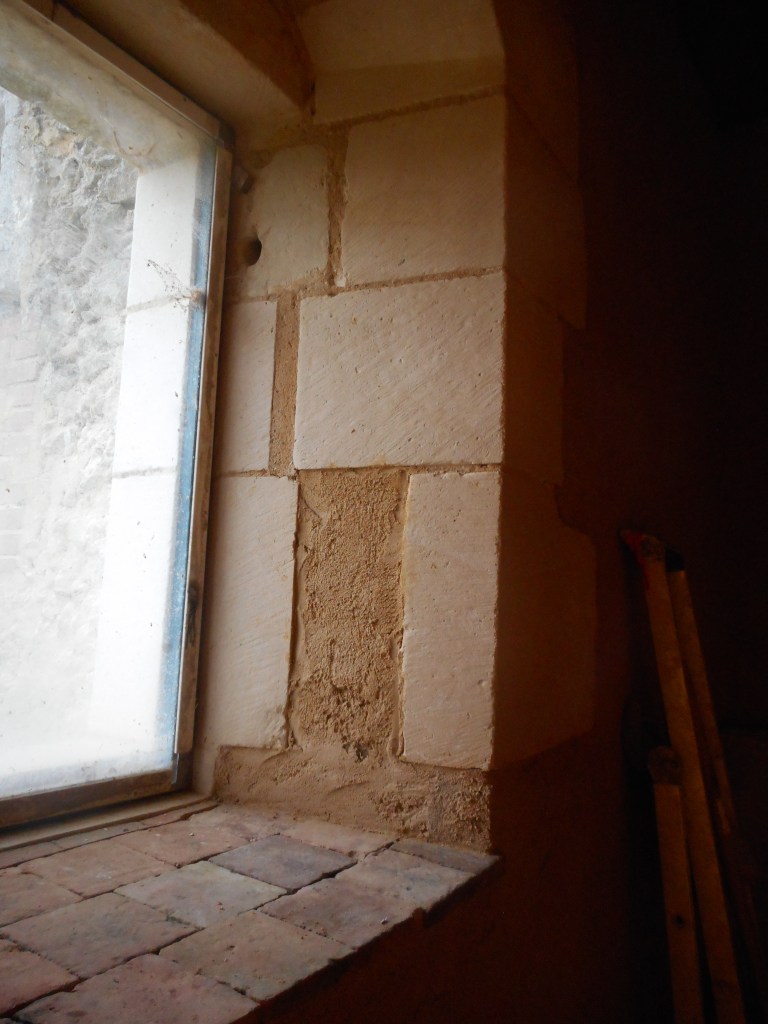 Le dégagement du bas de la fenêtre en septembre 2014, a fait apparaître le rebord intérieur de la fenêtre qui est revêtu de ses pavés d’origine de 13 cm de côté.