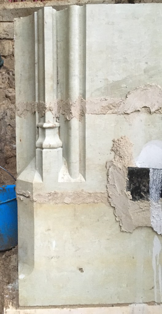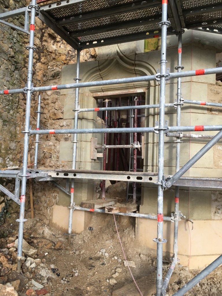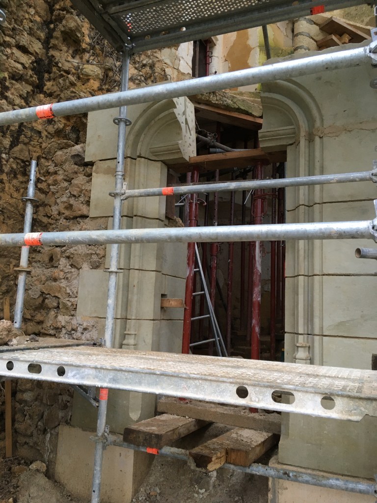 L’objectif est de s’engager dans une restitution de l’encadrement en pierre de taille, d’après les clichés anciens, les fragments placés en dépôt et les exemples similaires d’autres édifices.