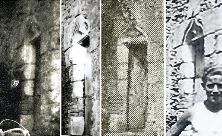 Vues de la porte d’accès à la tour durant la 1ère moitié du XXème avant son effondrement : La forme d’arc en accolade est bien identifiable. Le piédroit Nord présente une reprise parti elle en briques, suite à l’altération de l’encadrement liée au déséquilibre de la tour.