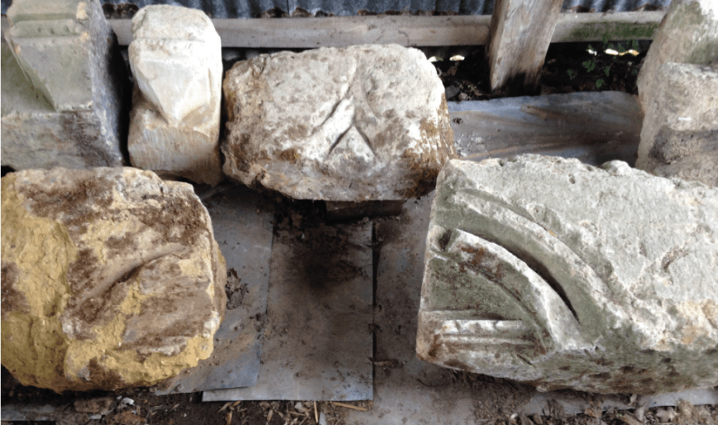 Pierres de l’ancienne porte placées en dépôt comprenant des éléments de piédroit et de l’arc en accolade.