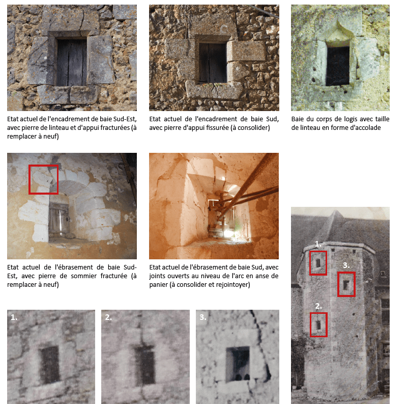 - La restitution des 3 ouvertures disparues en face Sud et Sud-Est linéaires lacunaires en face Ouest et Sud-Ouest