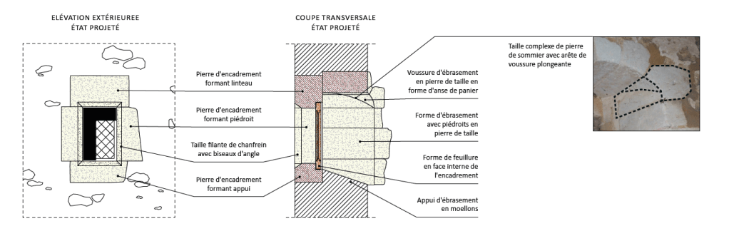 - Remplacement à neuf et à l’identique des pierres fracturées sur la baie Sud-Est (pierres de linteau et d’appui de l’encadrement extérieur, pierre de sommier de la voussure intérieure (voir les schémas)), incluant toutes sujétions de taille (forme de chanfrein filant en encadrement et ajustement des pierres pour parfaite insertion aux piédroits conservés).