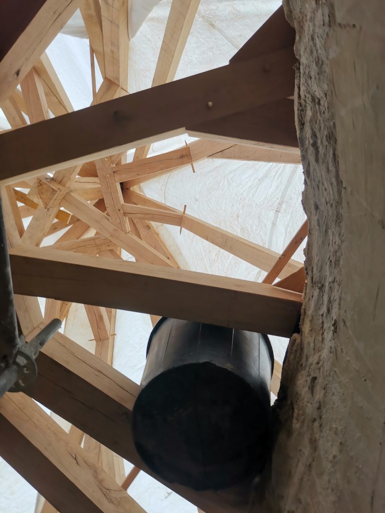 Où l’on voit les étapes de planification de restauration de la charpente et le travail en atelier La liste des précédents travaux peut être trouvée dans l’article ci-dessous. Synthèse des travaux en images Dépose ancien étaiement intérieur Terrassement et reprise des maçonneries de libage Dépose des marches lacunaire et reprise de l’étaiement Projet Etat actuel…