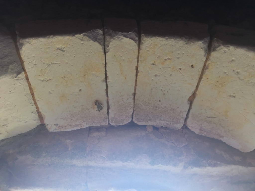 Tout le haut de cette baie est encore entouré de maçonnerie au mortier ocre d’origine mais avec de très nombreuses reprises d’enduit. Il s’agit donc d’une ouverture d’origine (l’étude intérieure le confirme).