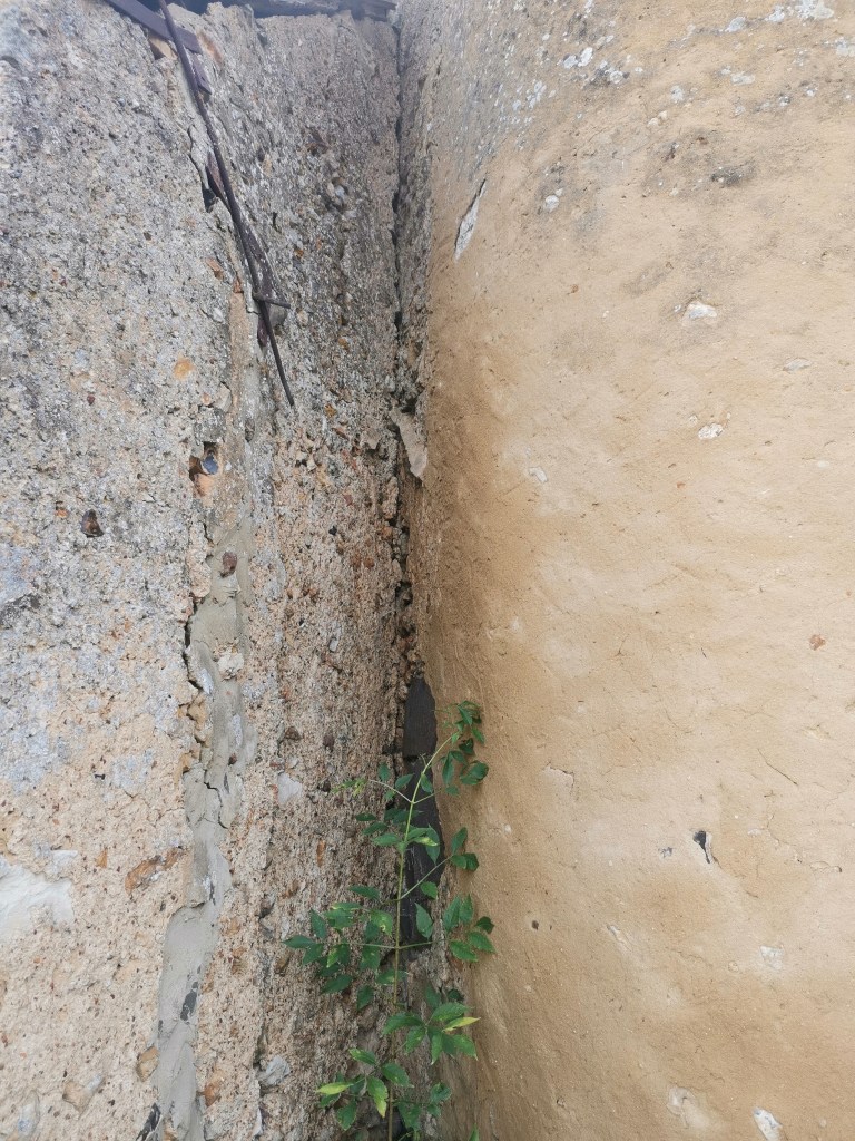 Plus bas, au dessus du mur d’enceinte (c’est-à-dire de la dépendance) on voit une différence dans l’enduit qui se manifeste par une réfection d’enduit plus claire, presque blanc, avec un moellon qui dépasse de la surface de l’enduit. Ce sont les signes manifestes d’un rebouchage ancien, mais de quoi ? S’agit-il de la démolition d’un mur qui venait s’appliquer contre la tour à cet endroit, autrement dit la preuve que le mur d’enceinte primitif était beaucoup plus haut qu’actuellement ? Si l’on en croit ces traces d’enduit, il aurait mesuré plus de 3 m de haut. Il peut y avoir une autre explication comme le bouchage d’un trou qui se serait formé par usure, hypothèse qui mérite d’être évoquée car au droit de ce rebouchage, il existe une fissure traversante, montant jusqu’à l’arase du mur et qui a été rebouchée vers 1930 lors des travaux de reconstruction de l’élévation du côté ouest (même enduit de couleur ocre jaune).