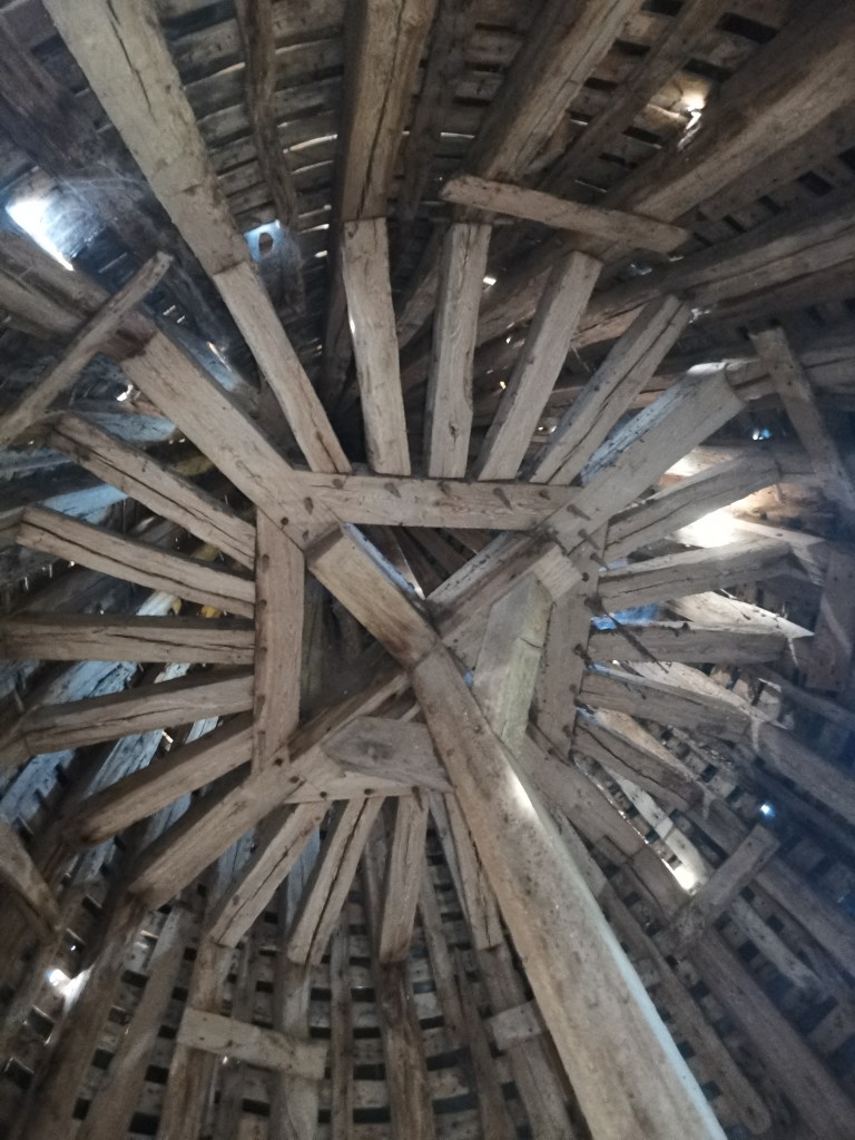 Chaque extrémité des solives s’enfonçaient de 15 cm dans le mur. Il n’en reste qu’une seule, celle qui longe le mur nord. Les autres ont été arrachées laissant seulement leur empreinte. Un huitième solive, plus courte, longe le mur sud et reste en place.