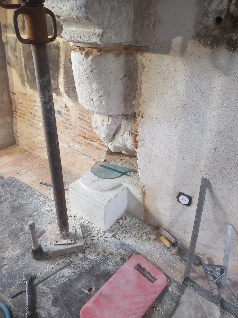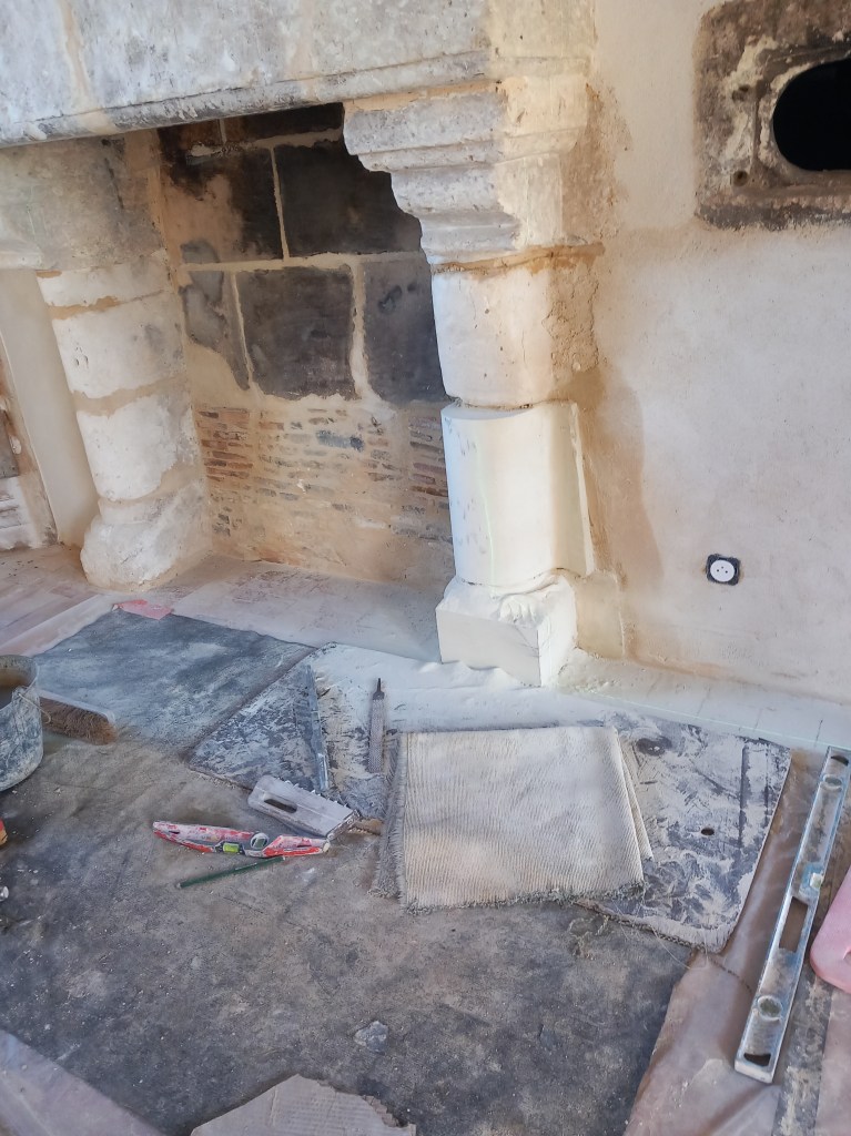 Les corbeaux et le linteau se sont révélés en bon état, mais le jambage droit et sa base étaient très détériorés, de même que le contre-cœur du foyer.