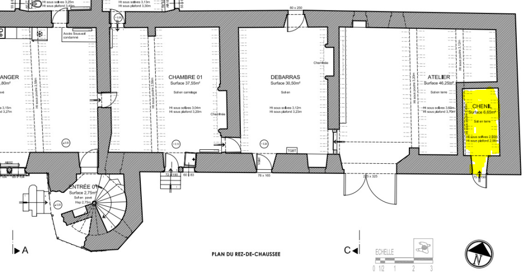 Cette pièce, autrefois condamnée et isolée, est sur le point de renaître. À terme, elle sera réouverte sur le pressoir, créant ainsi un espace fluide et cohérent. Un escalier sera installé, permettant un accès au premier étage.