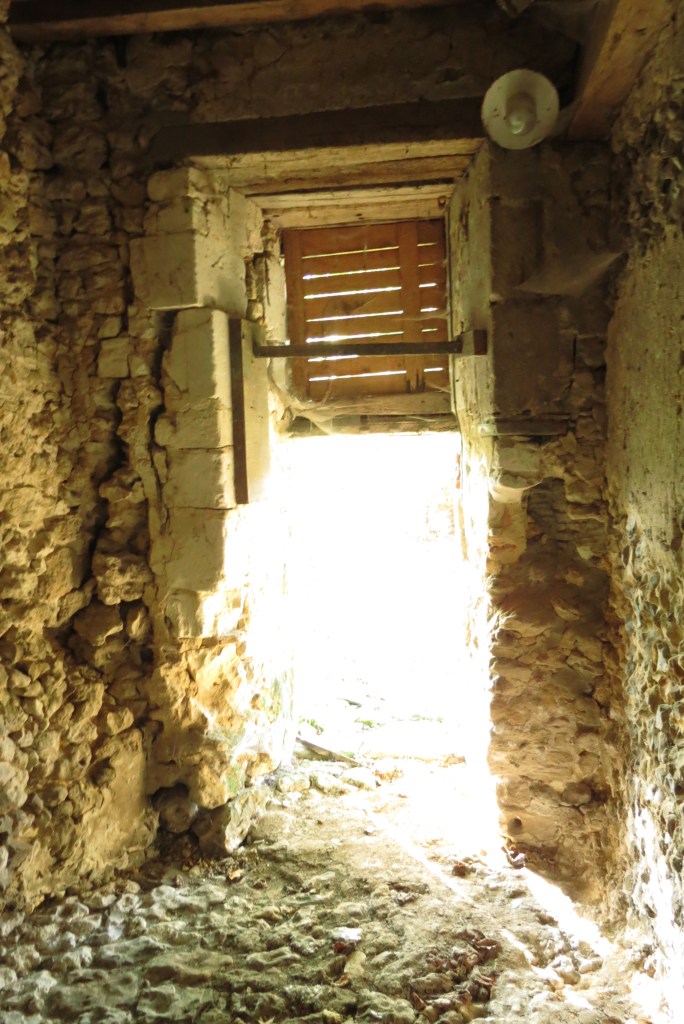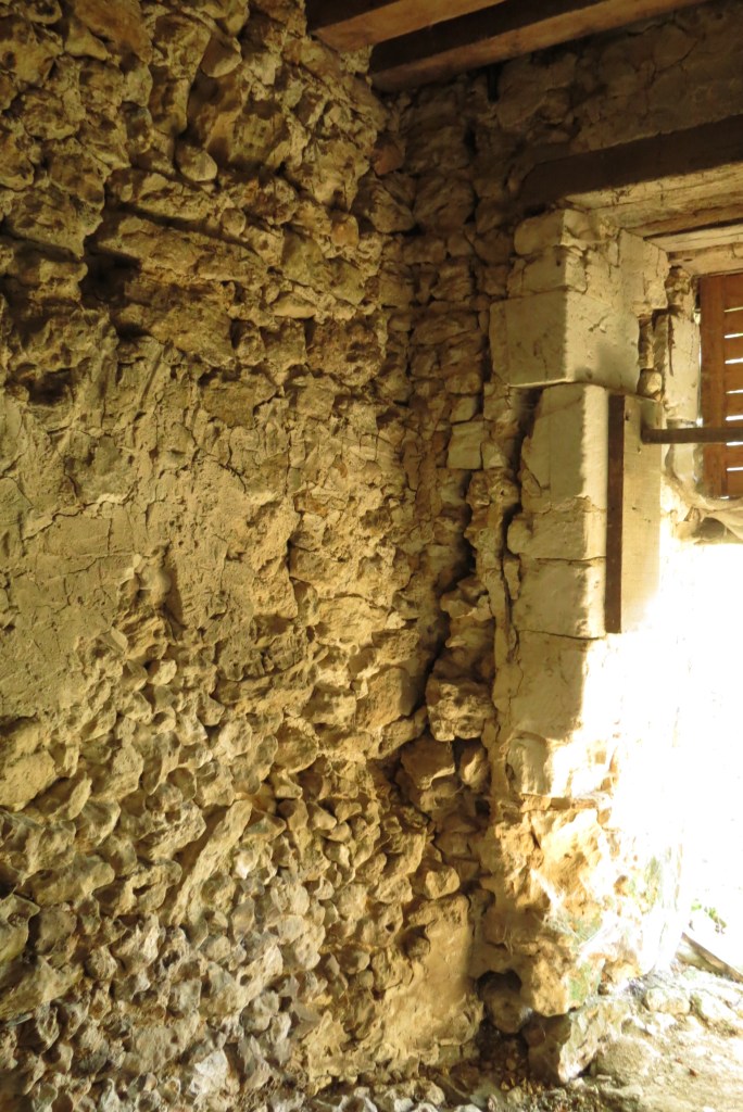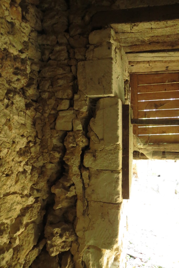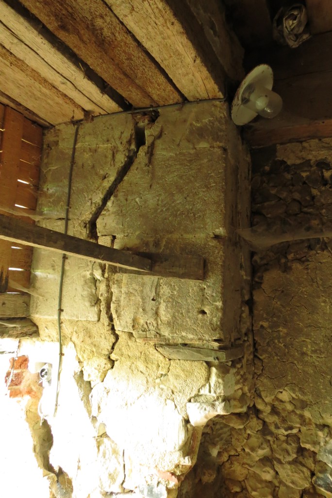 Depuis l’atelier, il existe un autre mur en moellon non enduit qui ne pénètre pas dans le mur de façade sud. Il est construit sous la poutre pour fermer une porcherie ou un chenil. Il ne date certainement que du début du XIXe siècle On est dans une sous pièce du Pressoir mais accessible uniquement…