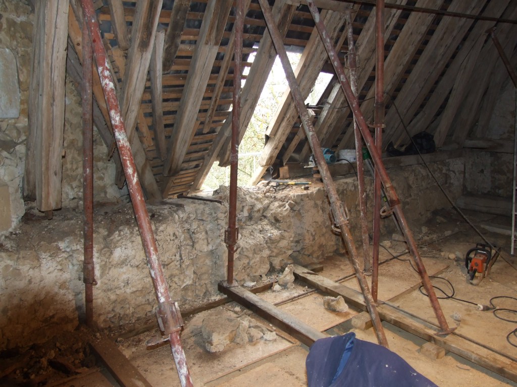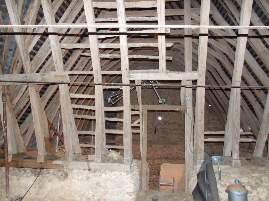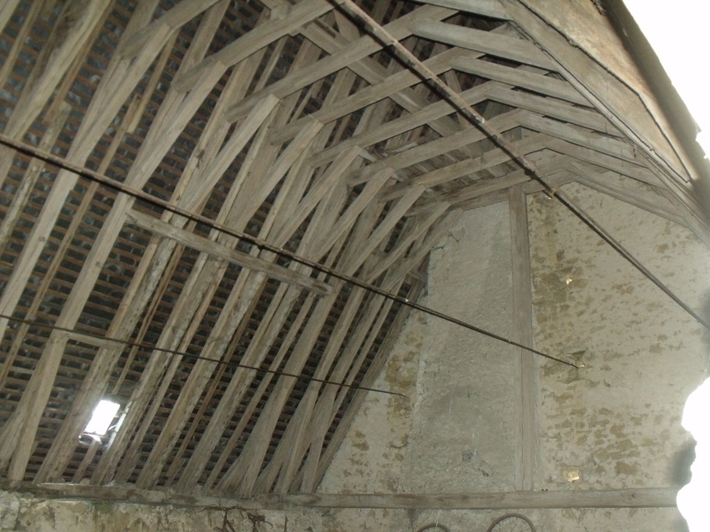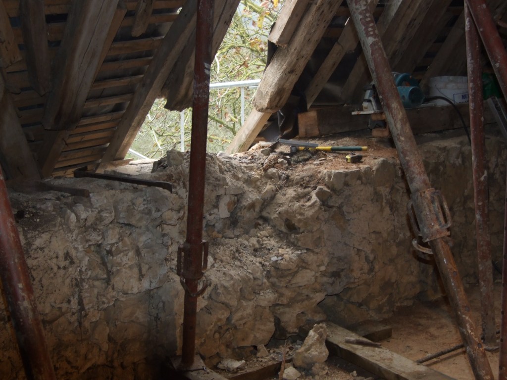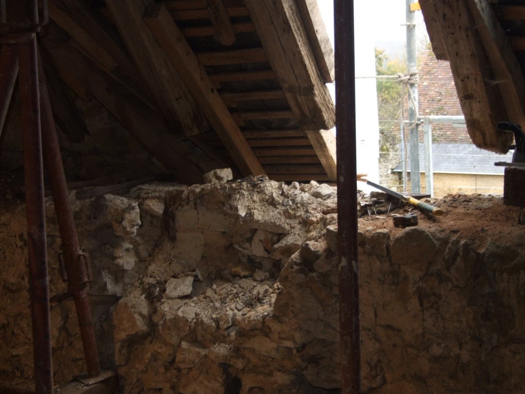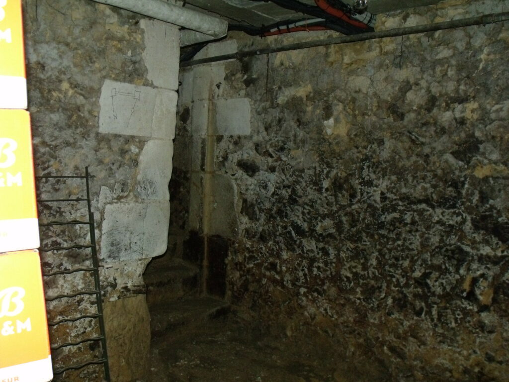 La fenêtre côté mur sud a été transformée en porte au XIXe siècle. Mais il en reste suffisamment de pierres d’origines pour pouvoir déterminer ses dimensions : 1,55 m de large, 1,79 m de haut. Elle est donc plus petite que celle de la salle (1,62 sur 1,84 m). On peut en conclure que la dimension de la fenêtre est calculée en fonction de la taille de la pièce à éclairer.