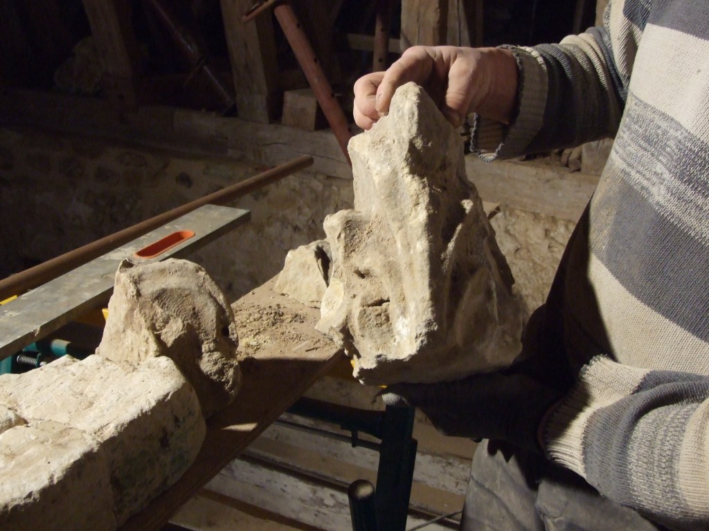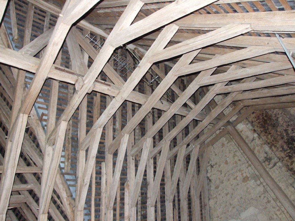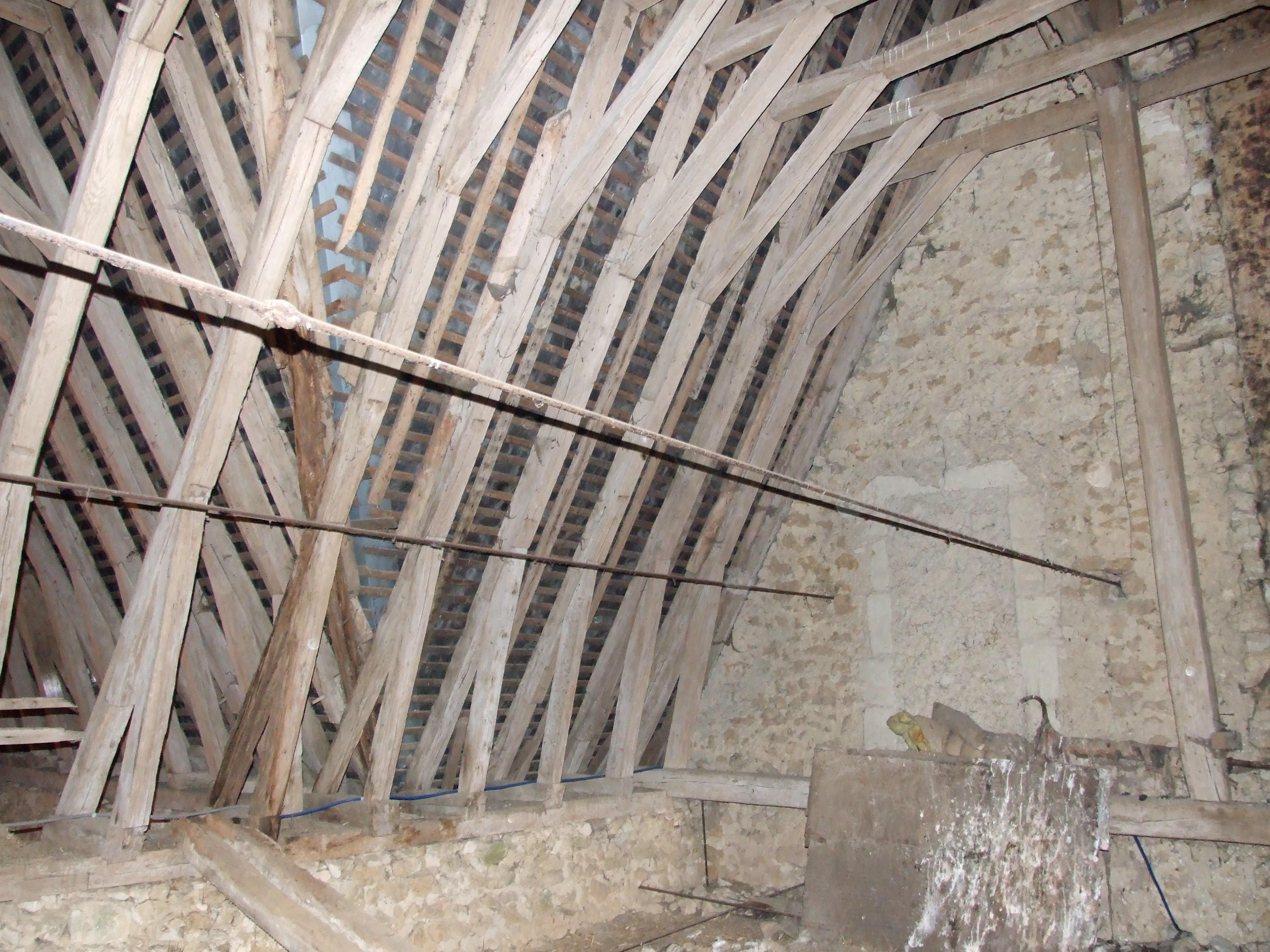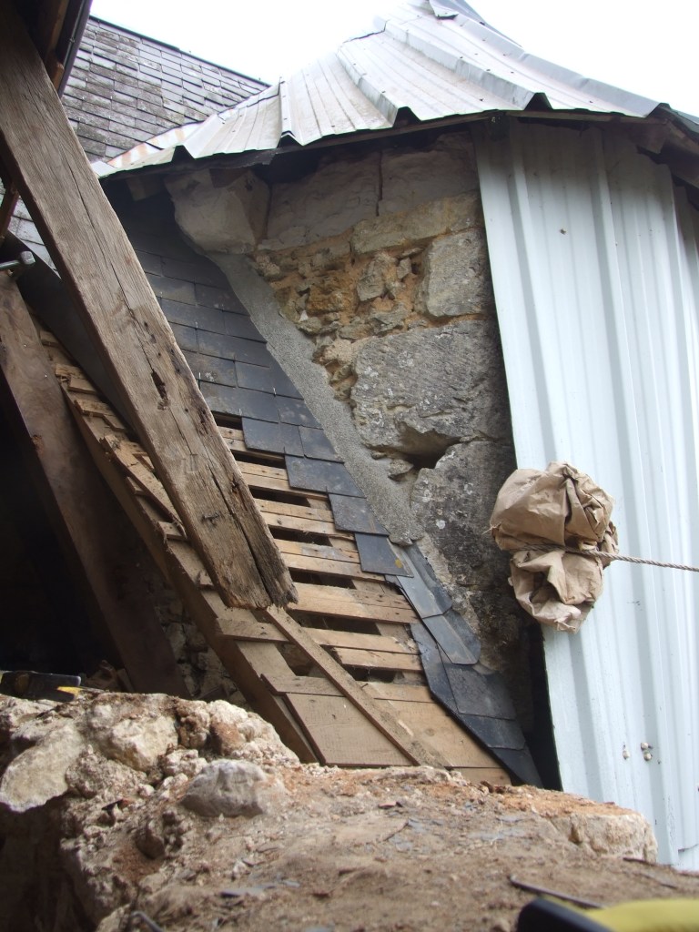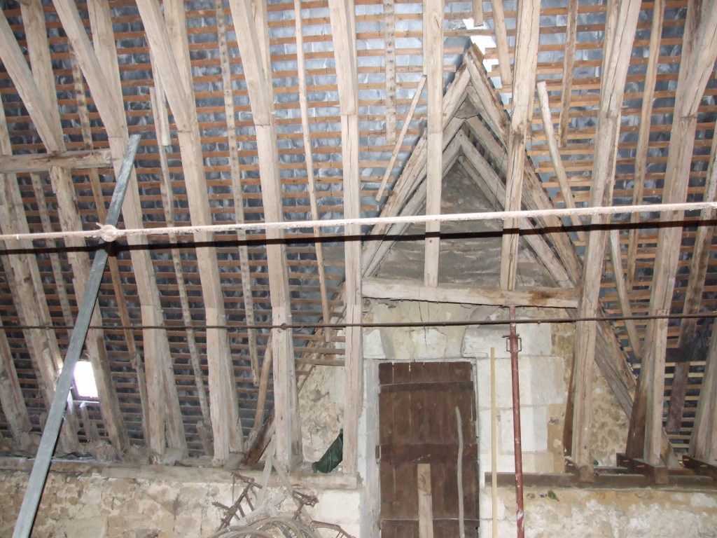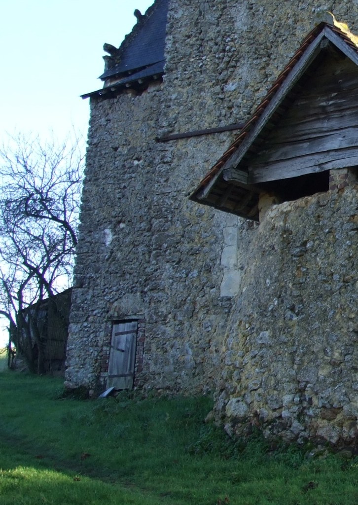 moulures, un blason est sculpté mais hélas le meuble est effacé. Il ne pouvait s’y voir que les armoiries des Tiercelin avec leur sautoir tiercé. Le sommier entre en biais dans le mur pour épauler la cheminée qui, comme toujours à cette époque n’est pas renforcée d’une barre de fer. La hotte, à la différence de la cheminée de la salle, est traversée par un arc de décharge en forme segmentaire et appareillé. Au sommet, on ne trouve aucune trace de corniche, ce qui n’a rien d’étonnant tant les exemples de hotte sans corniches sont fréquents au XVe siècle.