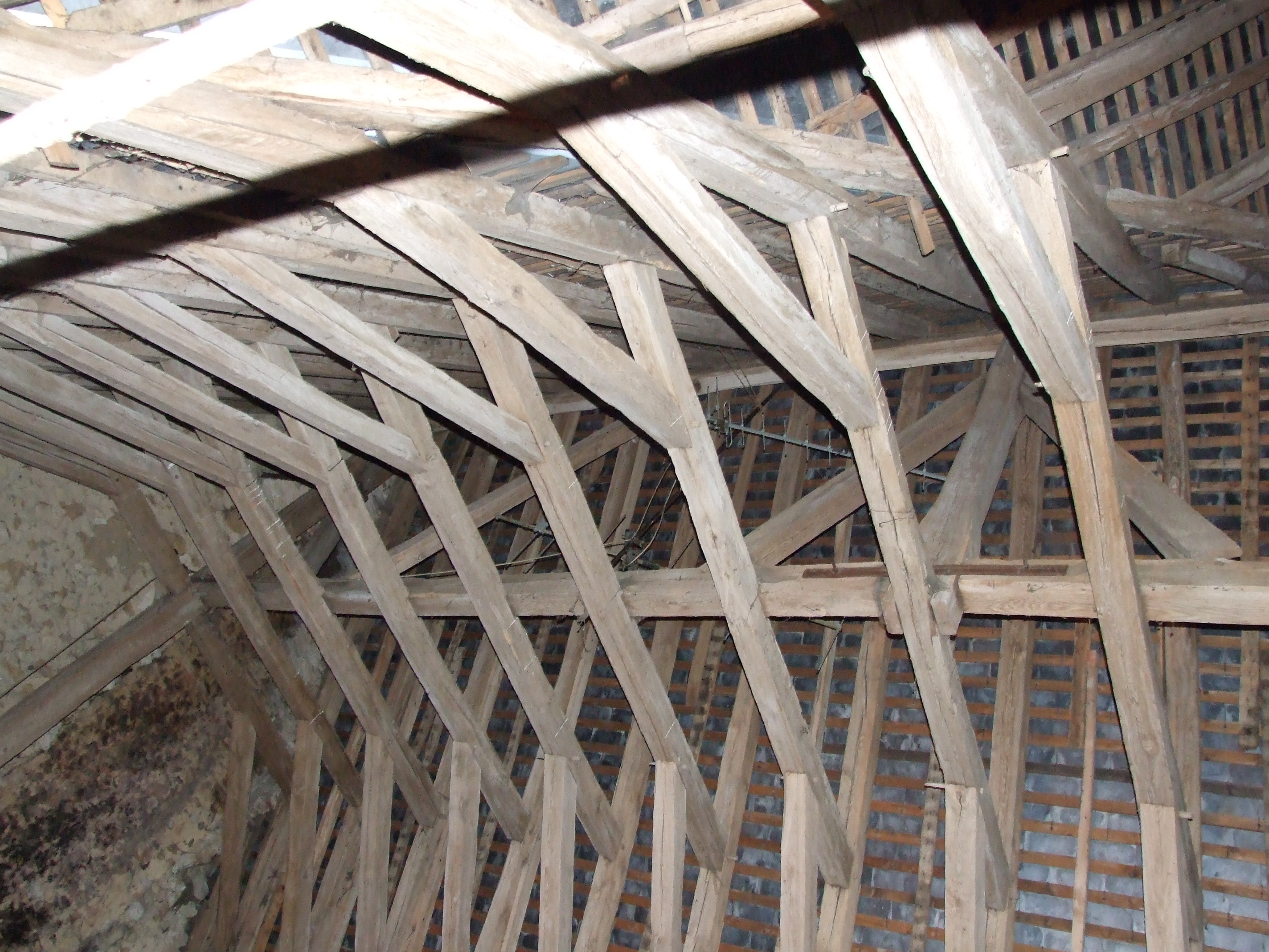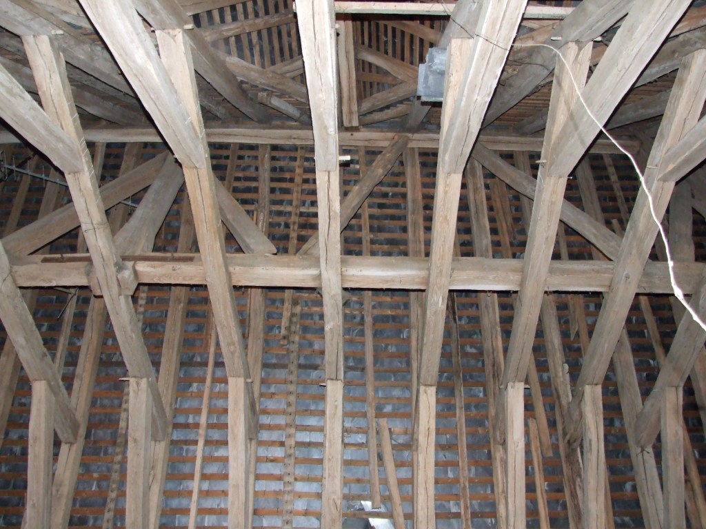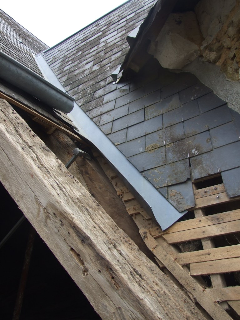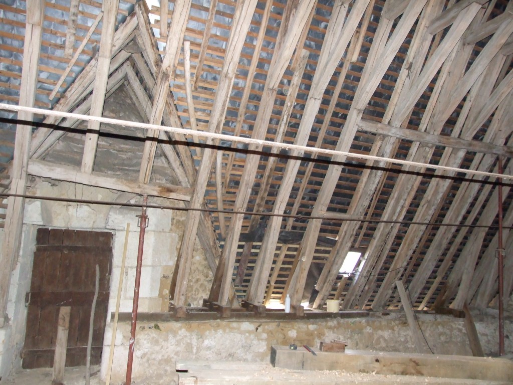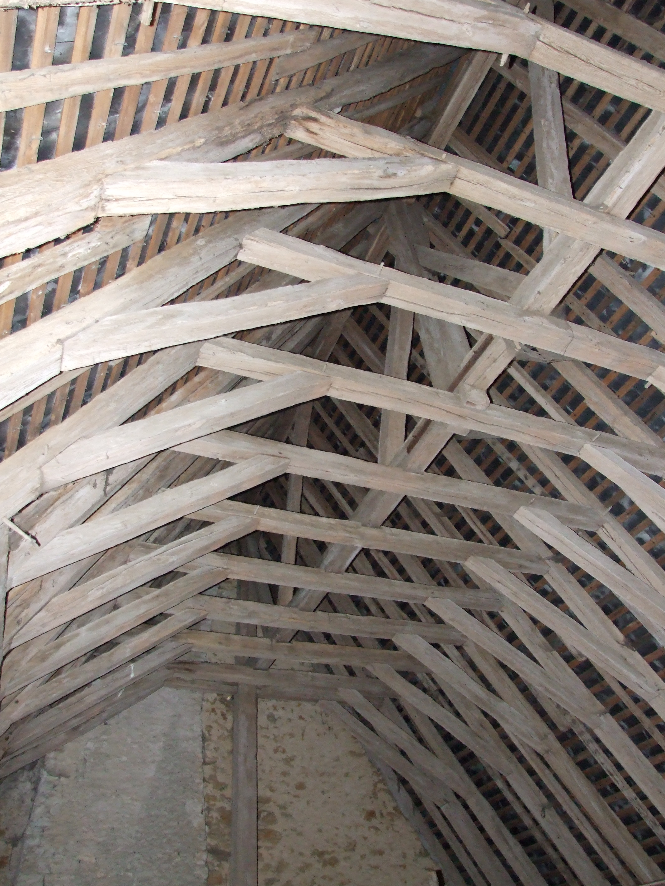 moulures, un blason est sculpté mais hélas le meuble est effacé. Il ne pouvait s’y voir que les armoiries des Tiercelin avec leur sautoir tiercé. Le sommier entre en biais dans le mur pour épauler la cheminée qui, comme toujours à cette époque n’est pas renforcée d’une barre de fer. La hotte, à la différence de la cheminée de la salle, est traversée par un arc de décharge en forme segmentaire et appareillé. Au sommet, on ne trouve aucune trace de corniche, ce qui n’a rien d’étonnant tant les exemples de hotte sans corniches sont fréquents au XVe siècle.