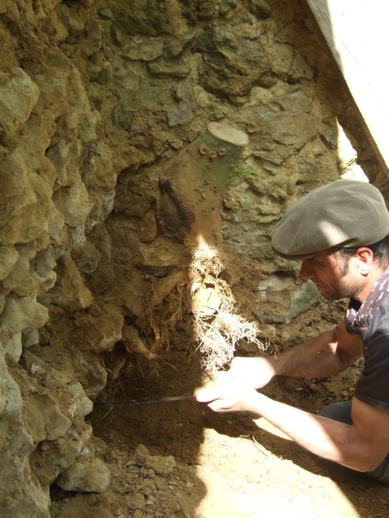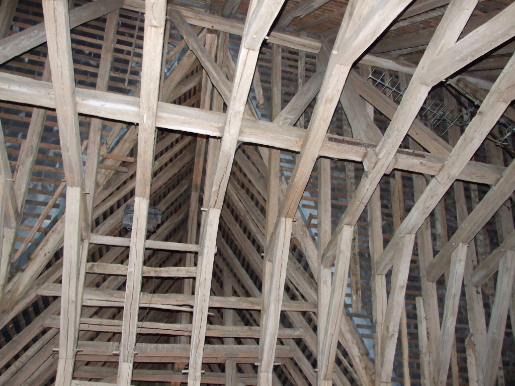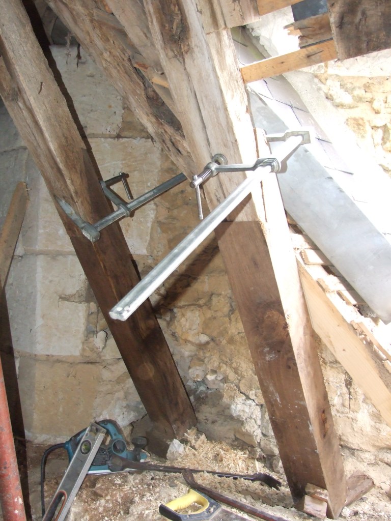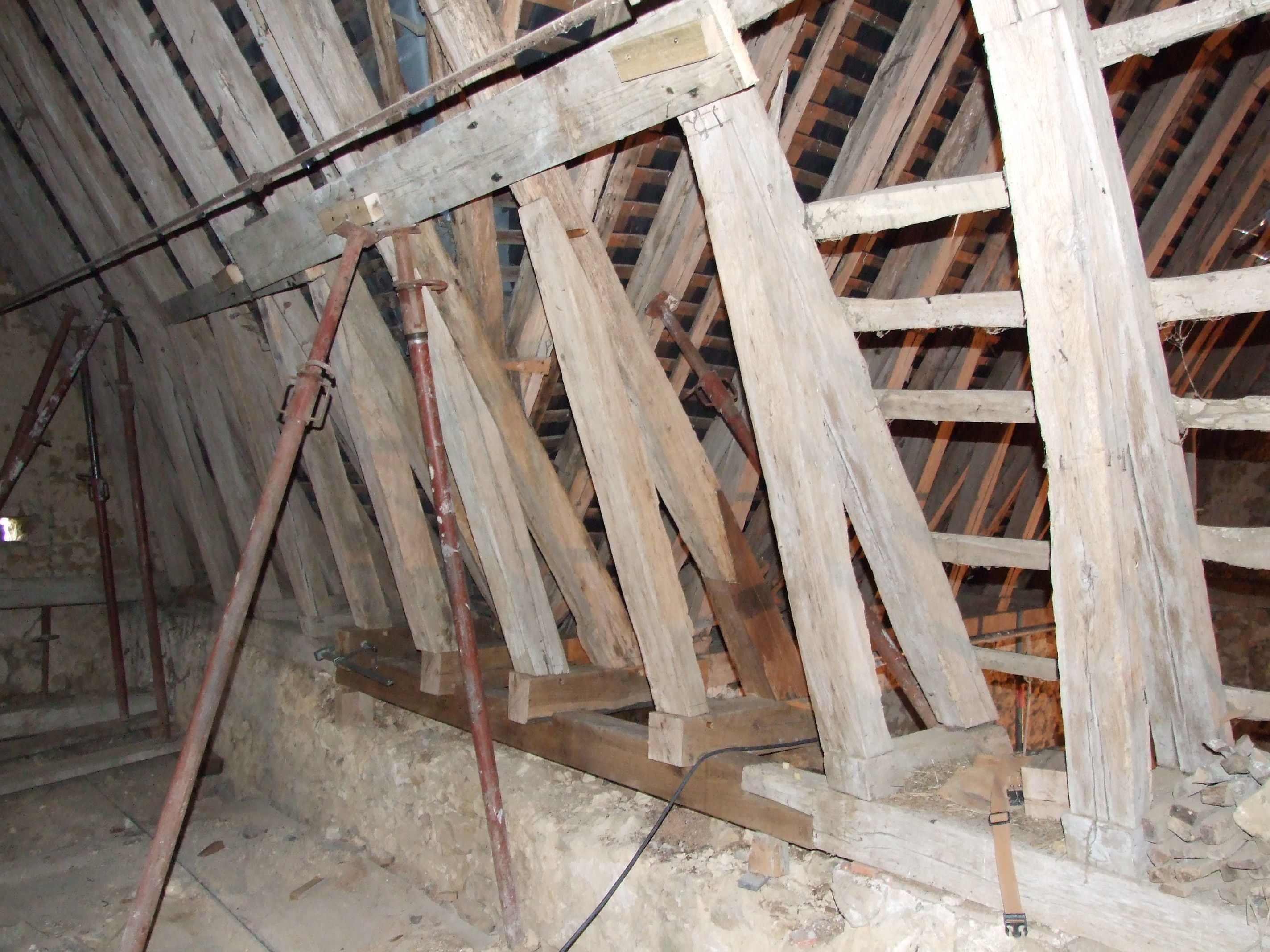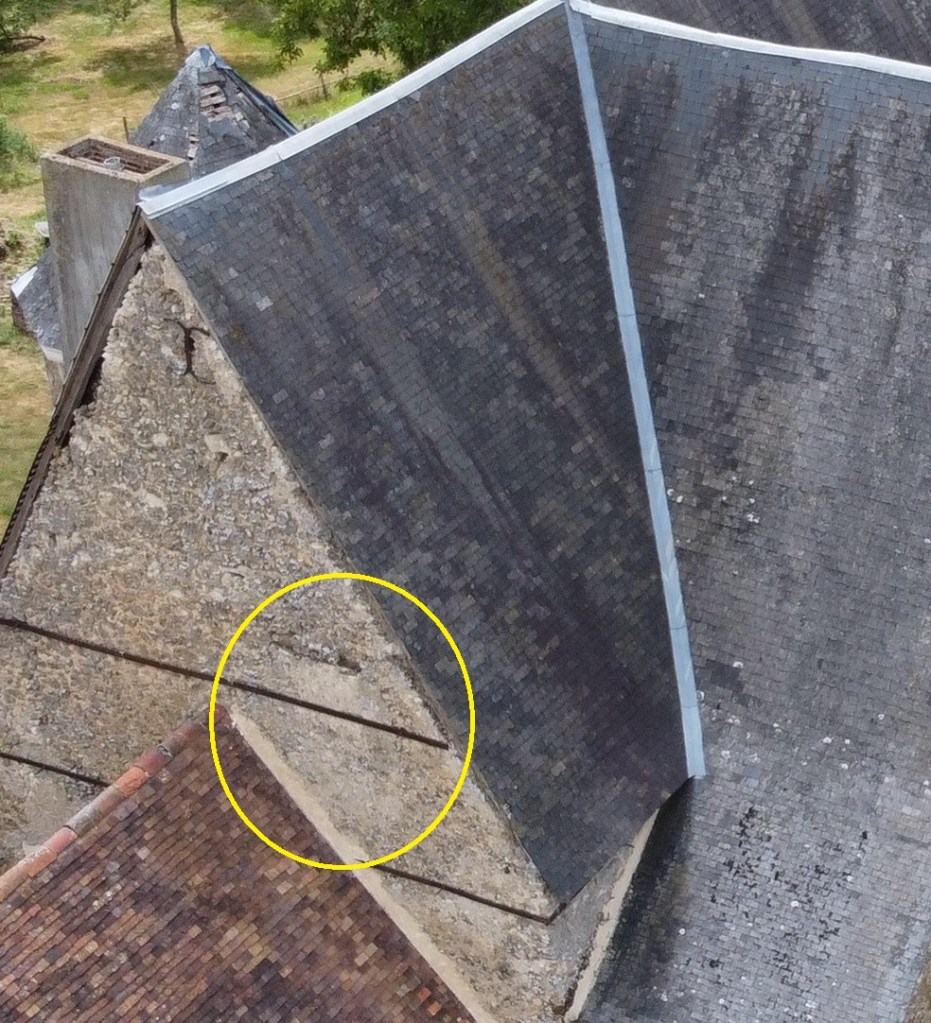 moulures, un blason est sculpté mais hélas le meuble est effacé. Il ne pouvait s’y voir que les armoiries des Tiercelin avec leur sautoir tiercé. Le sommier entre en biais dans le mur pour épauler la cheminée qui, comme toujours à cette époque n’est pas renforcée d’une barre de fer. La hotte, à la différence de la cheminée de la salle, est traversée par un arc de décharge en forme segmentaire et appareillé. Au sommet, on ne trouve aucune trace de corniche, ce qui n’a rien d’étonnant tant les exemples de hotte sans corniches sont fréquents au XVe siècle.