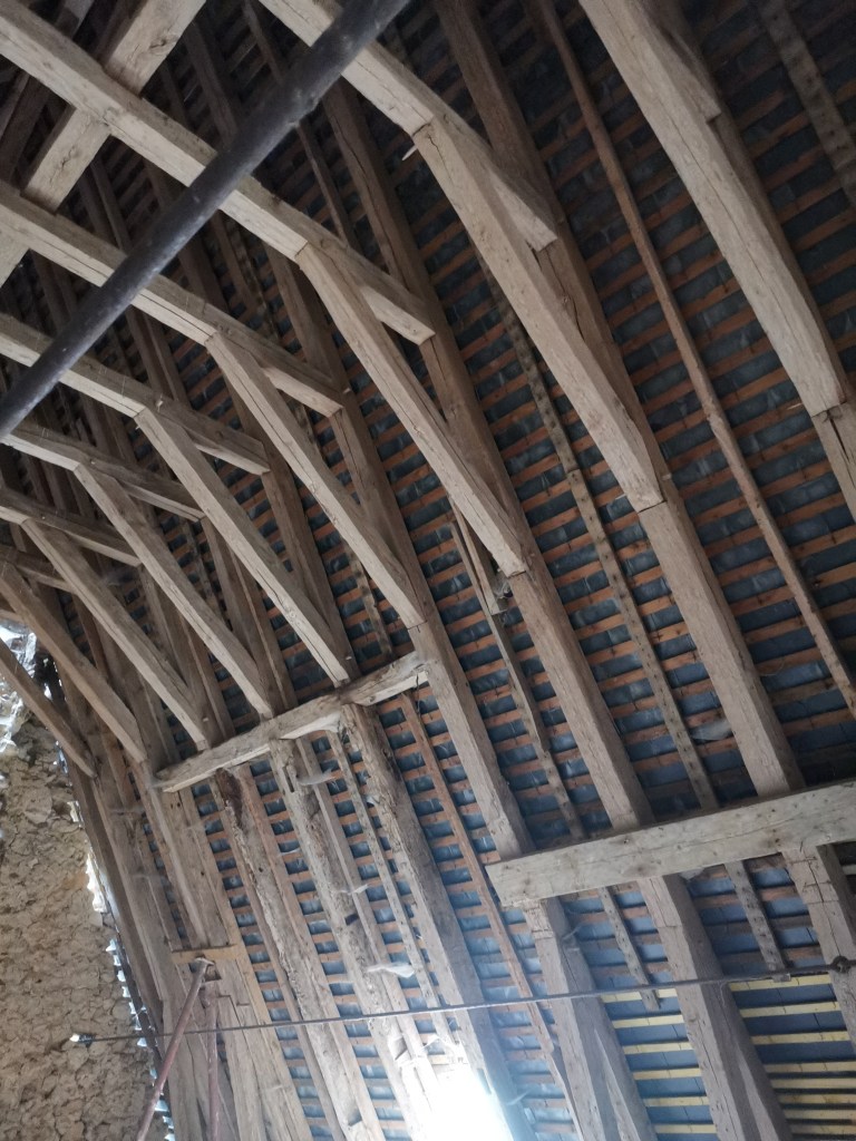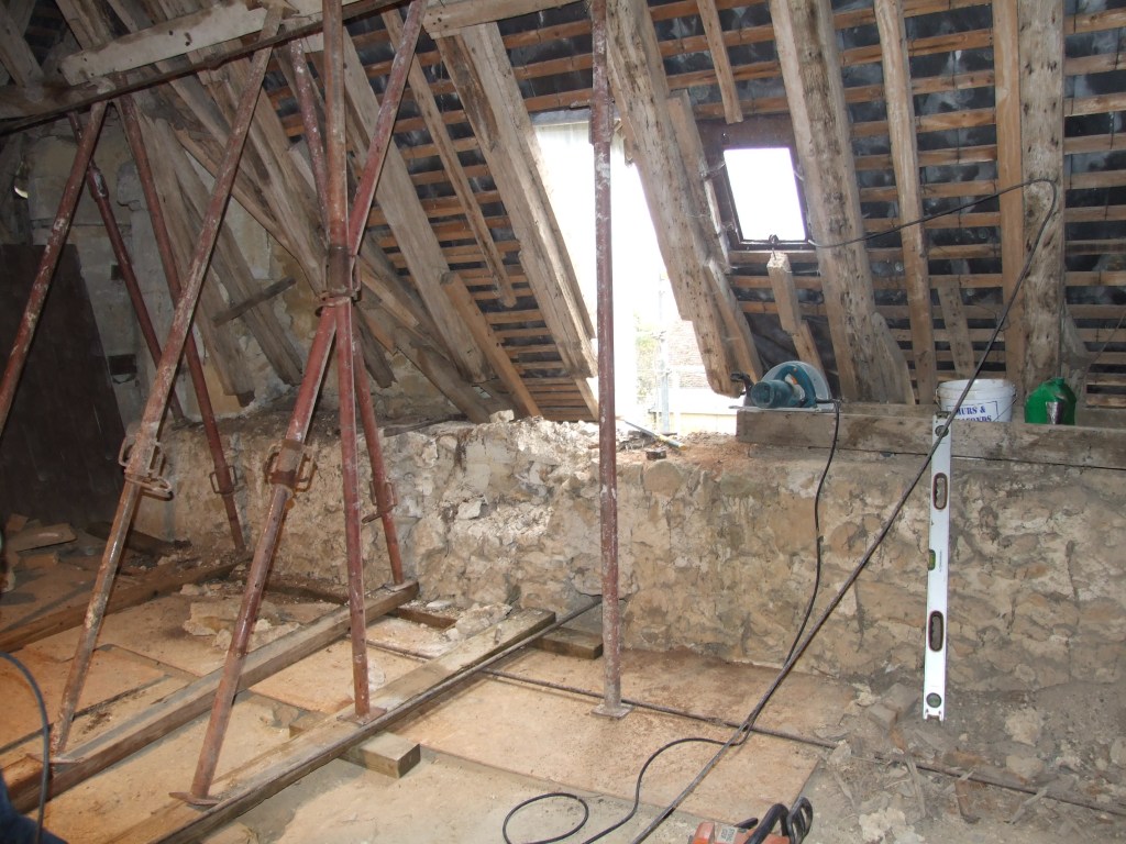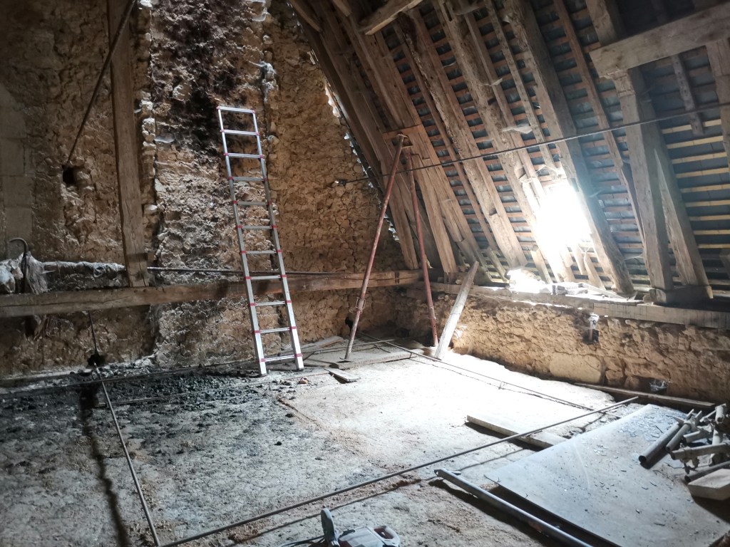 Le niveau de cette chambre est plus haut de 28 cm aujourd’hui que la salle. Il est bien d’origine, comme en atteste l’entrée sur l’escalier. En effet, la porte d’entrée de la chambre sur l’escalier se situe sur la première marche de l’escalier. Autre indice que le niveau est d’origine : la base des jambages de la cheminée qui n’est pas amputée mais au contraire bien complète.