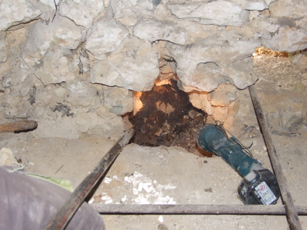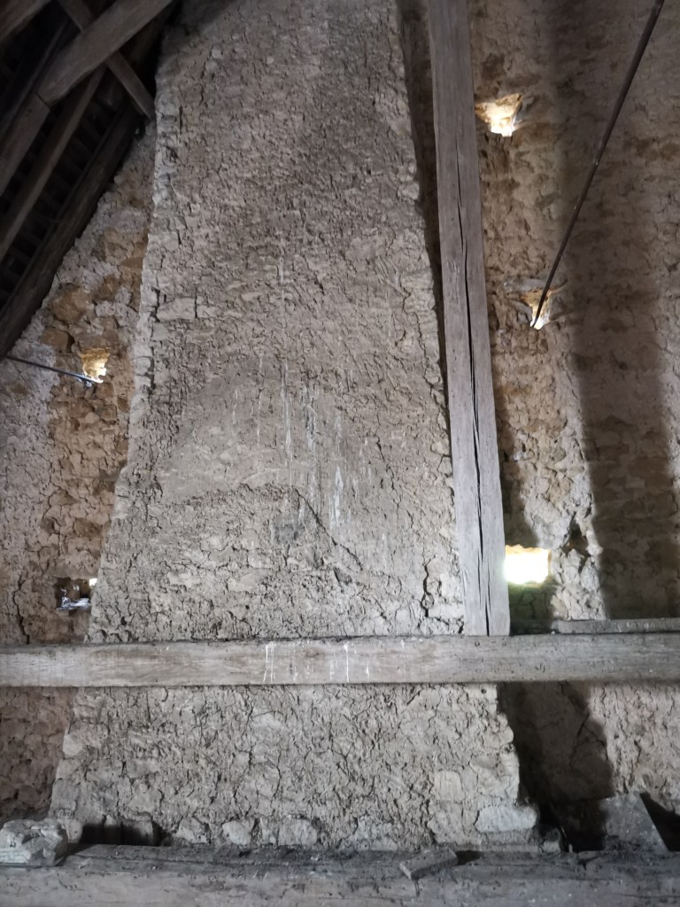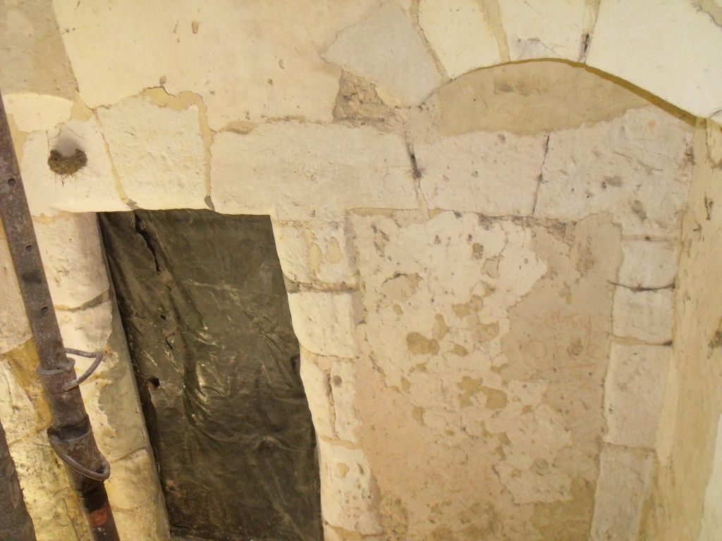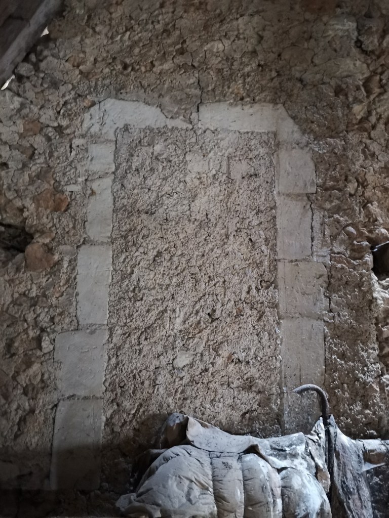 Côté chambre la porte est totalement murée et recouverte d’un enduit. Sous la peinture, on distingue cependant l’ébrasement sous un arc segmentaire appareillé. On distingue également les traces d’un ostevent sur le mur ouest