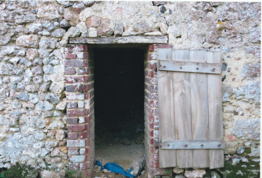 Une porte donne accès à l’aile Est. Son ouverture mesure 66 cm de large et 1,60 m de haut. Le seuil de 14 cm de haut est aujourd’hui en brique. En effet, le niveau de la chambre de l’aile Est était supérieur à celui de la présente chambre. Le vantail ne date que des environs de 1900.