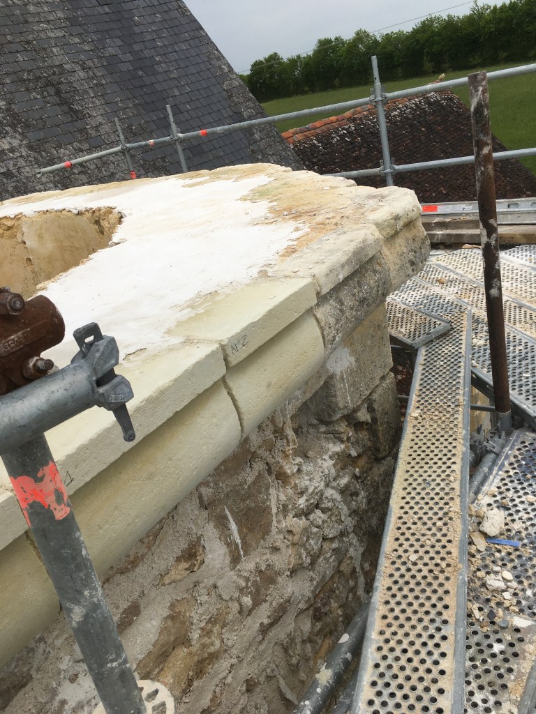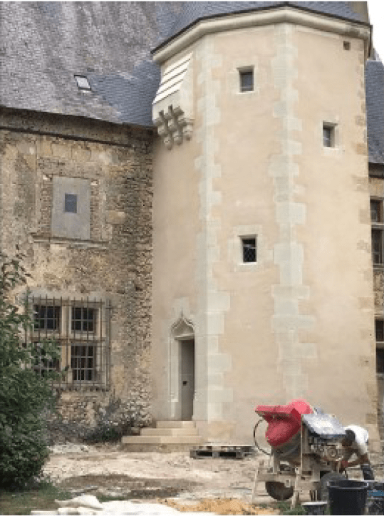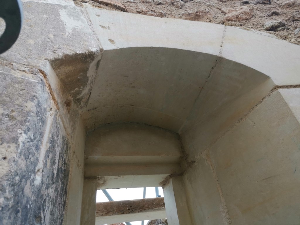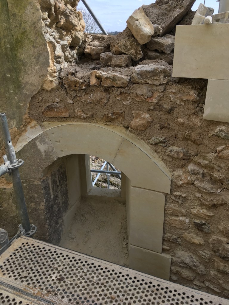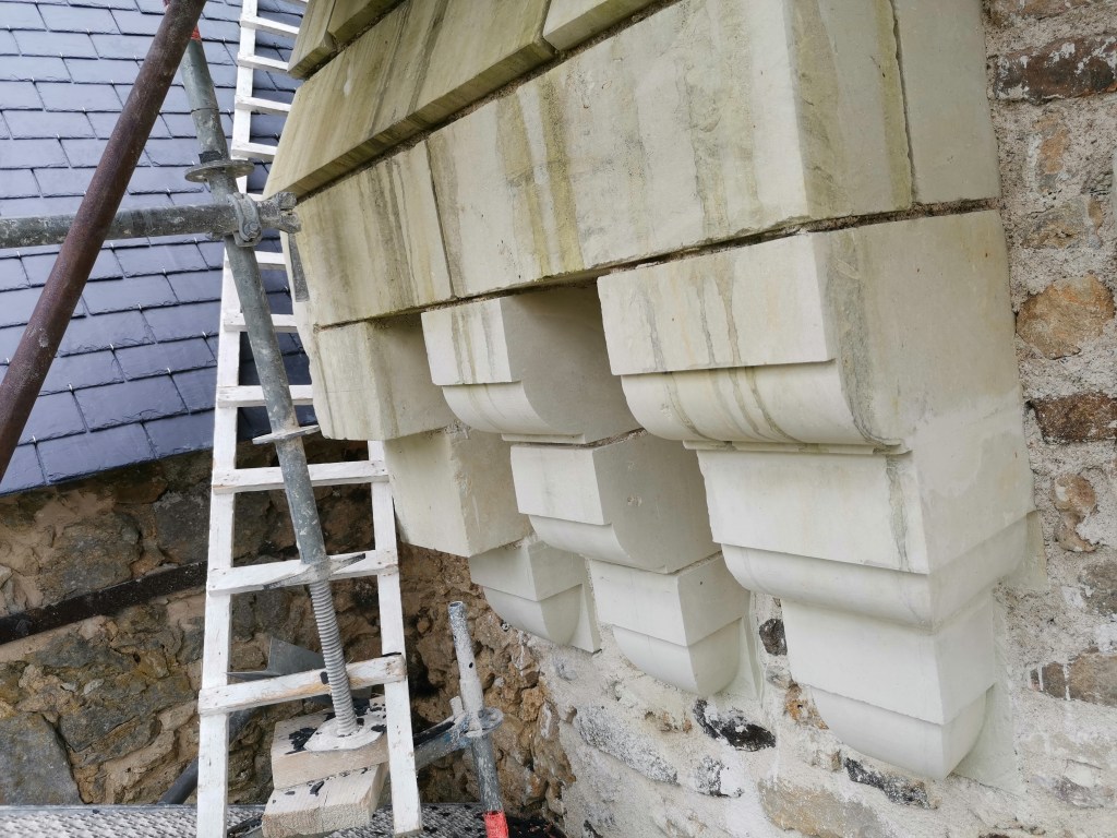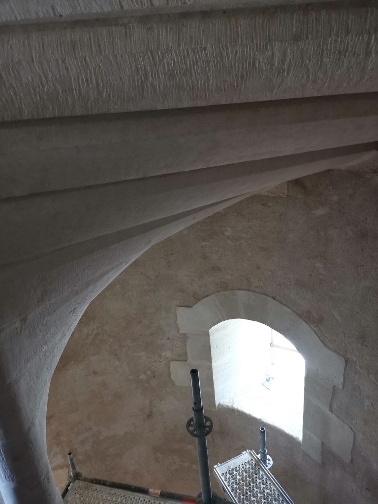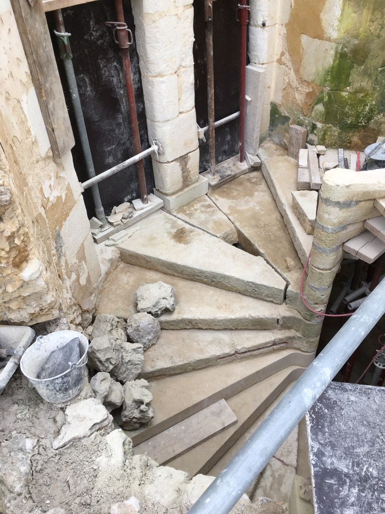 Lire la suite : Chantier de restauration et reconstruction de la tour d’escalier – 15 – Réalisation des tailles de finitions et de vieillissement sur parements et marches