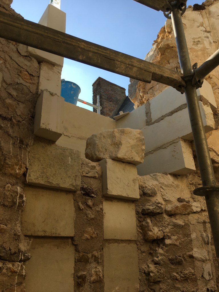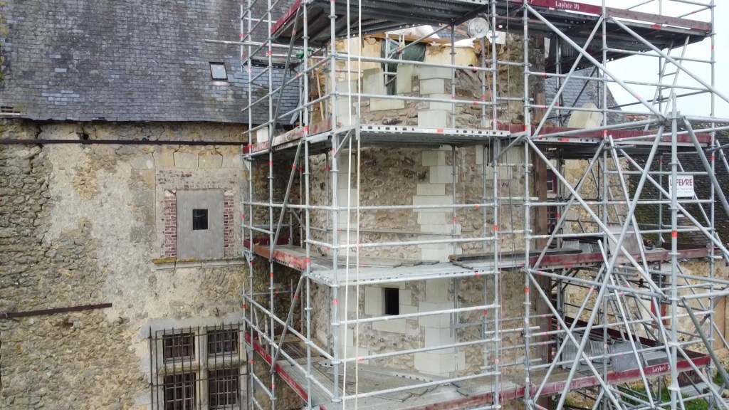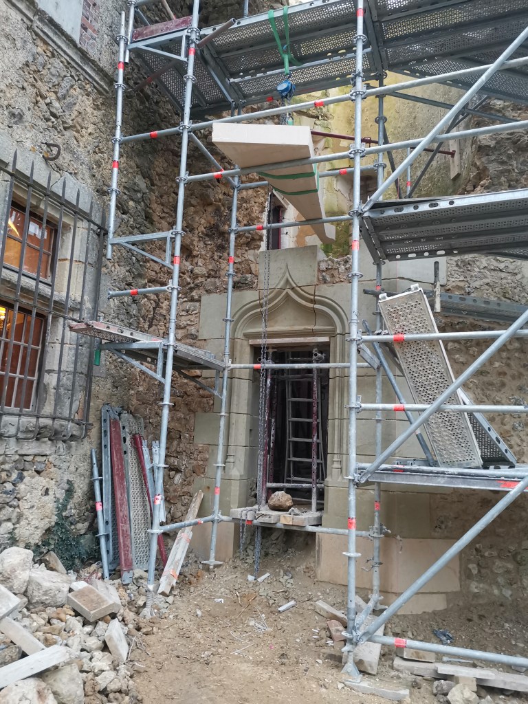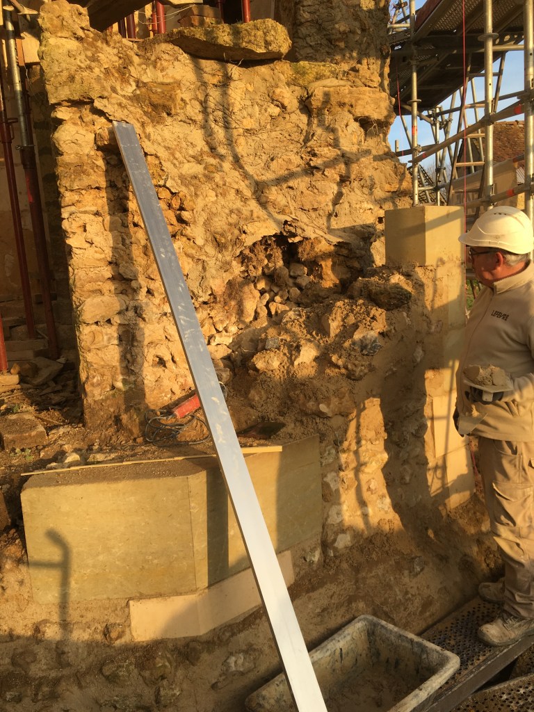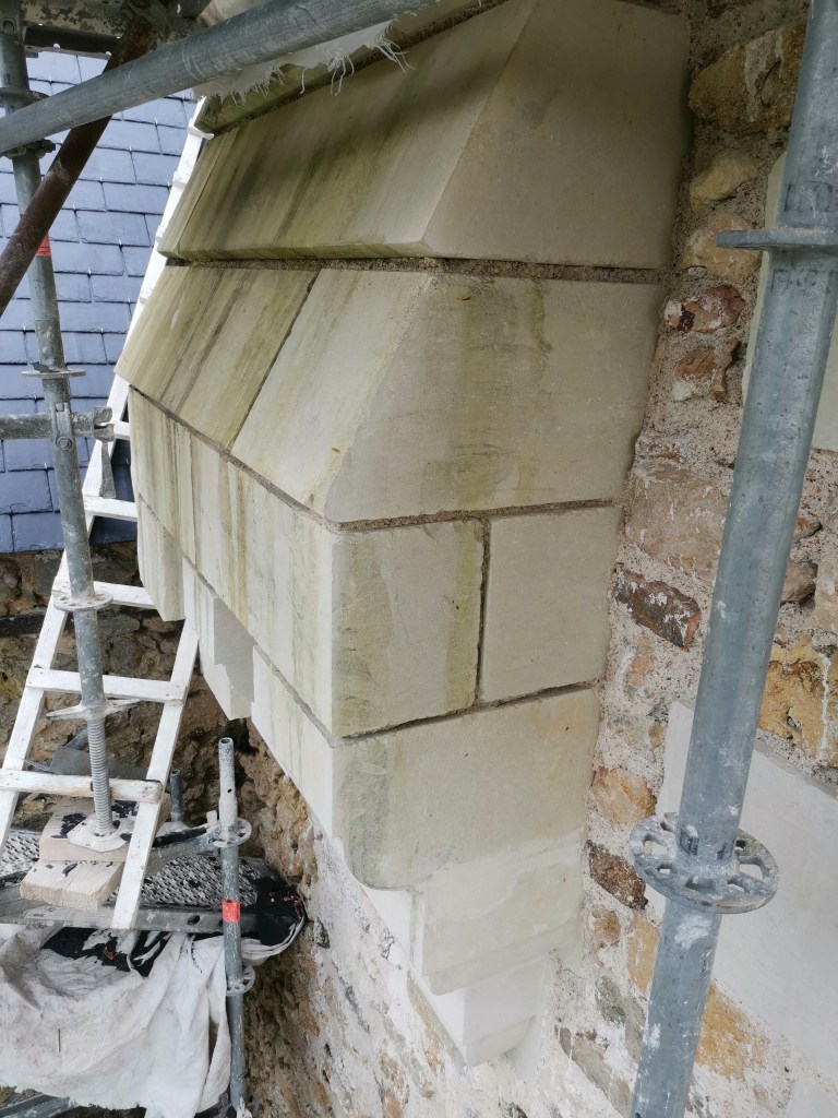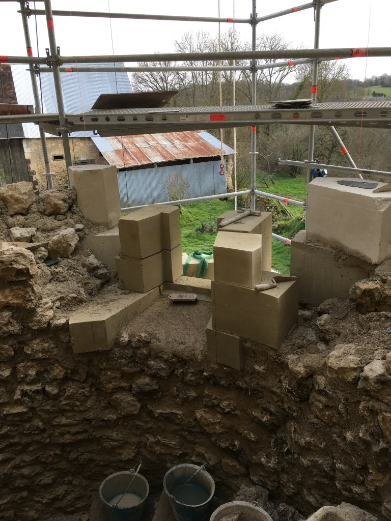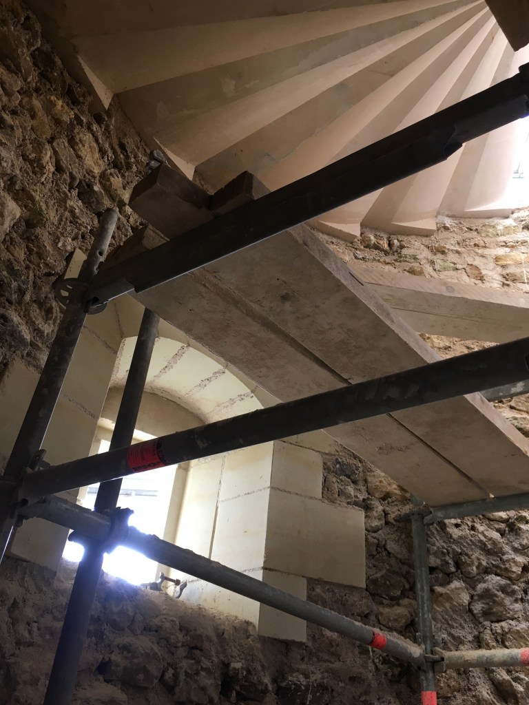 Lire la suite : Chantier de restauration et reconstruction de la tour d’escalier – 15 – Réalisation des tailles de finitions et de vieillissement sur parements et marches