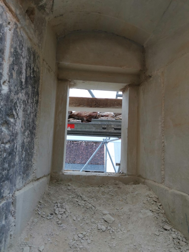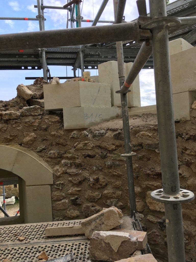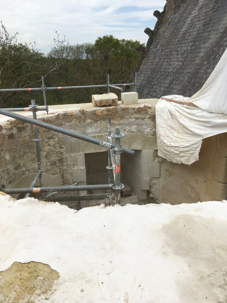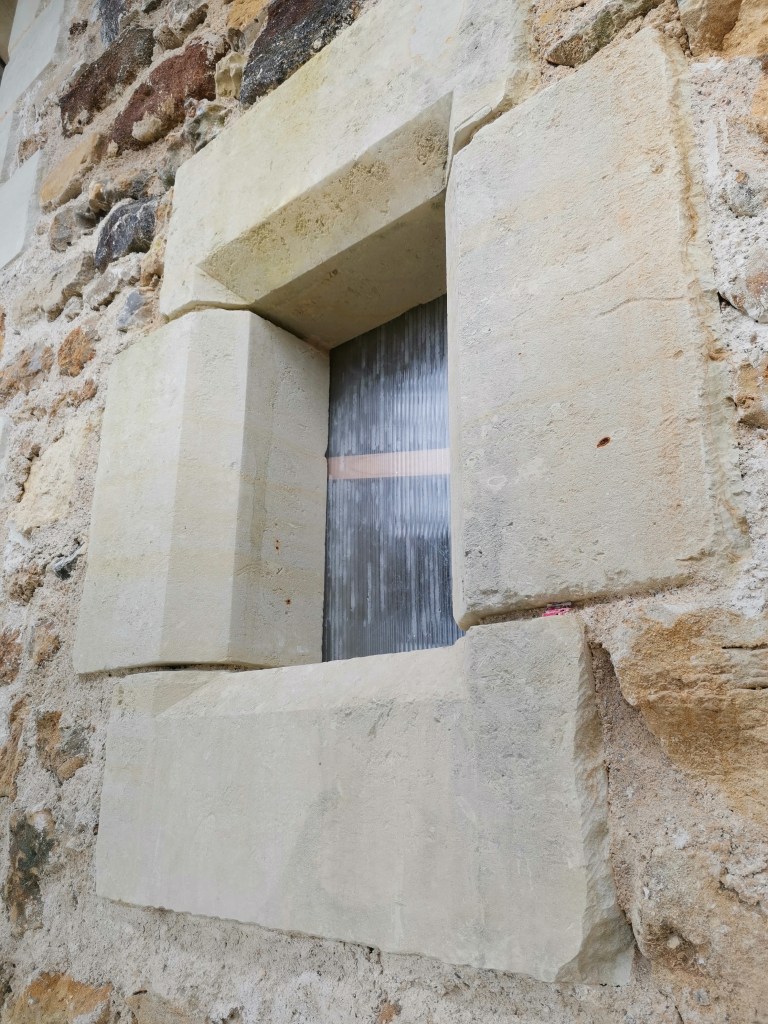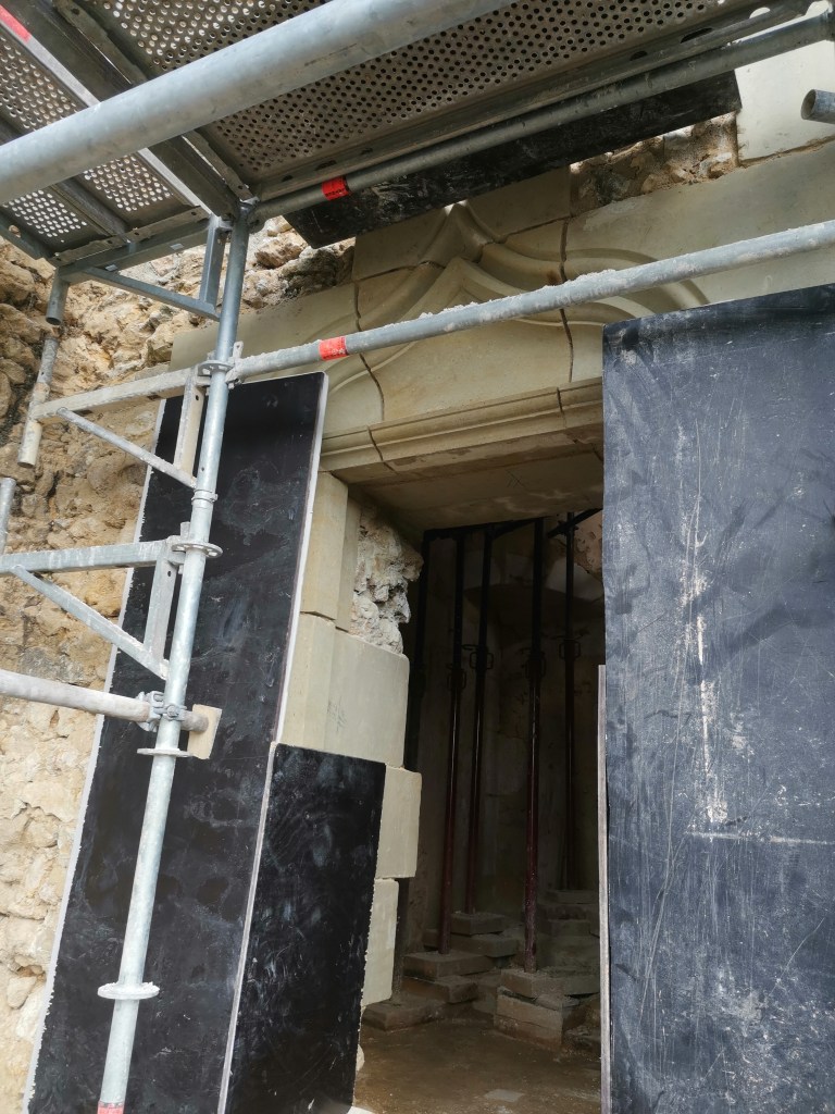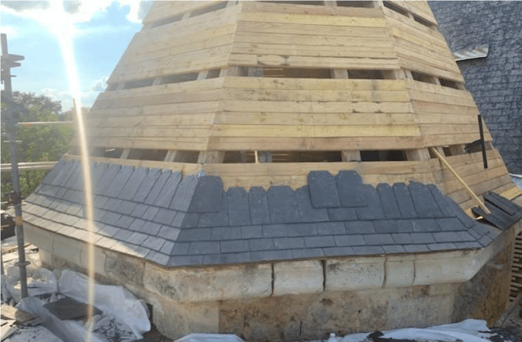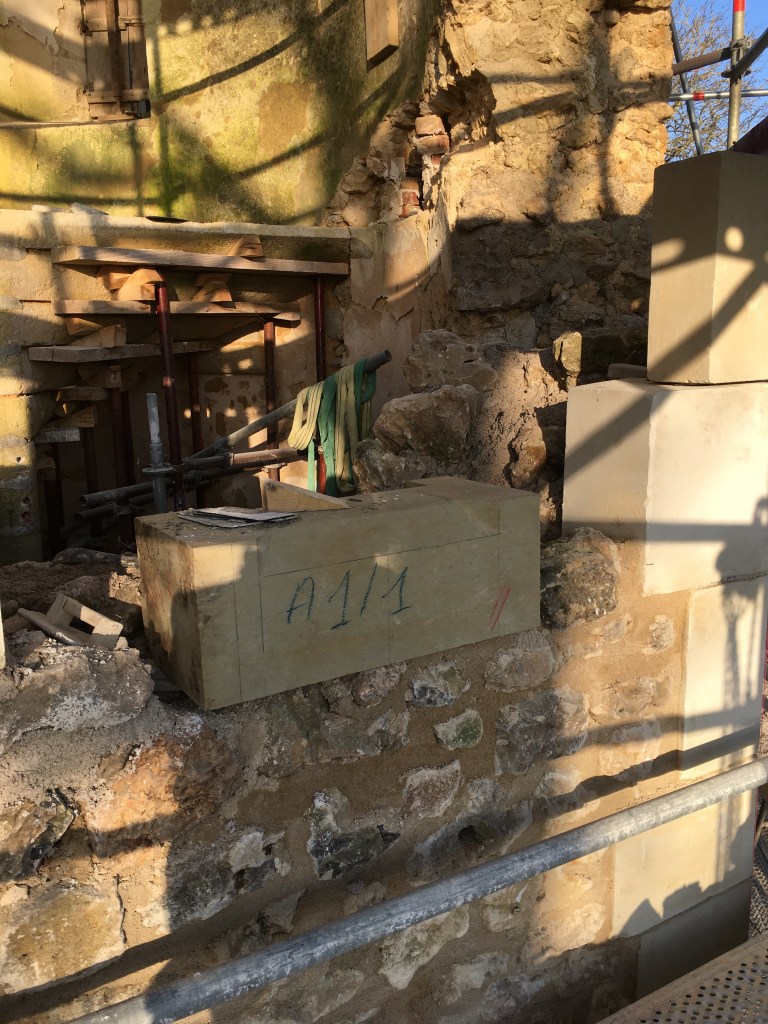 Lire la suite : Chantier de restauration et reconstruction de la tour d’escalier – 15 – Réalisation des tailles de finitions et de vieillissement sur parements et marches