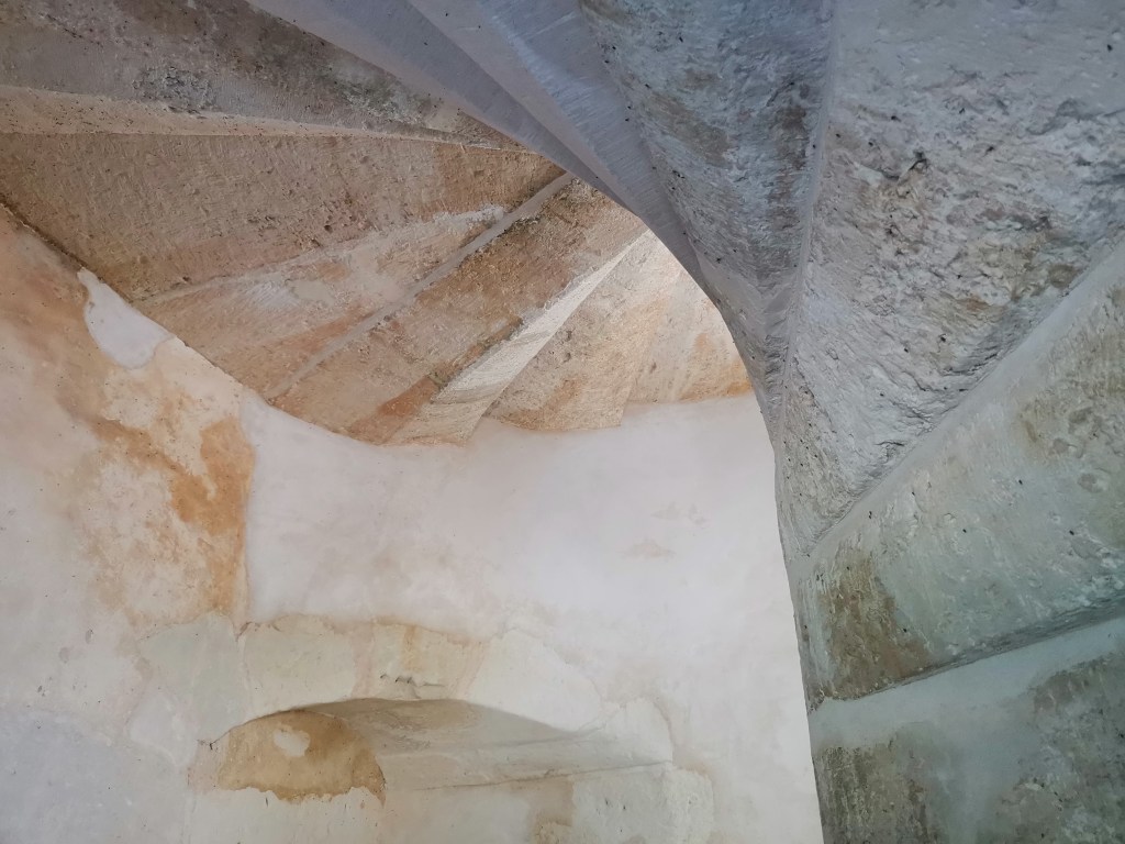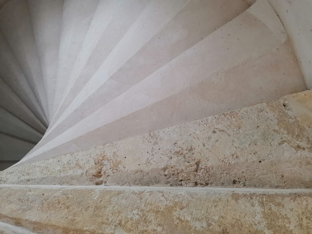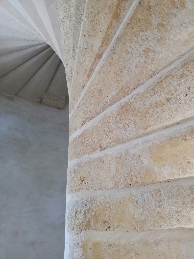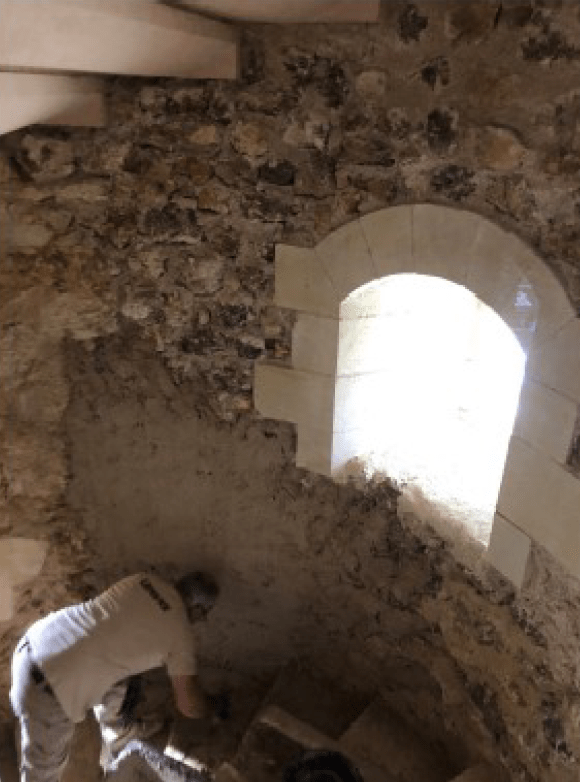 Chantier de restauration et reconstruction de la tour d’escalier – 15 – Réalisation des tailles de finitions et de vieillissement sur parements et marches