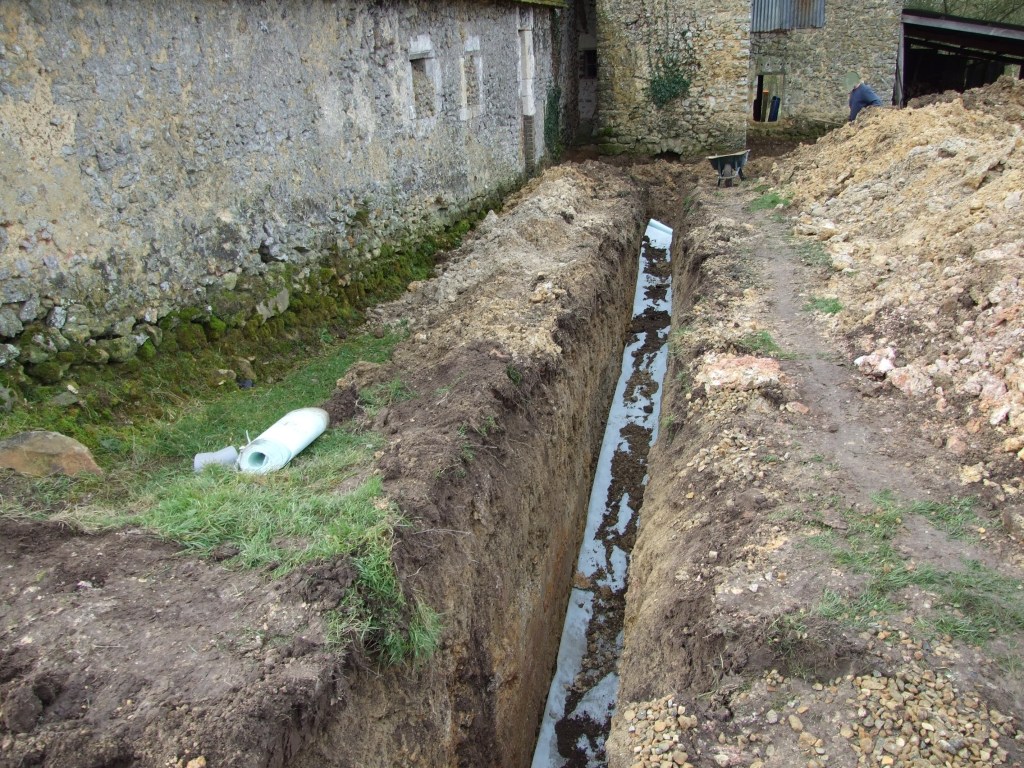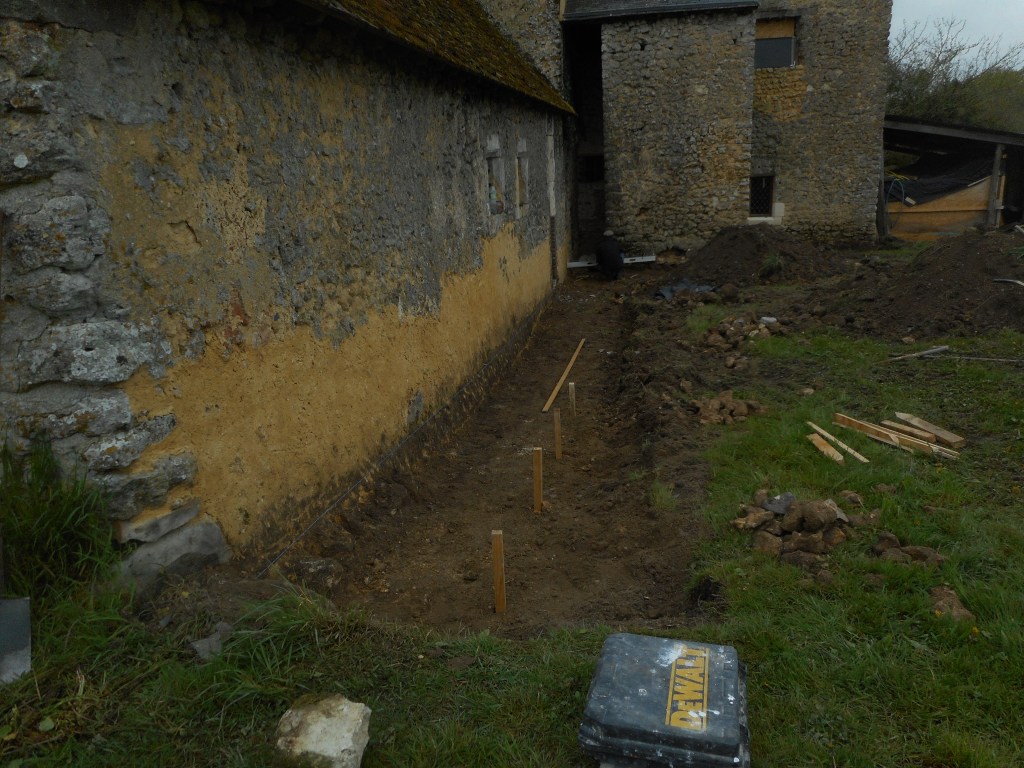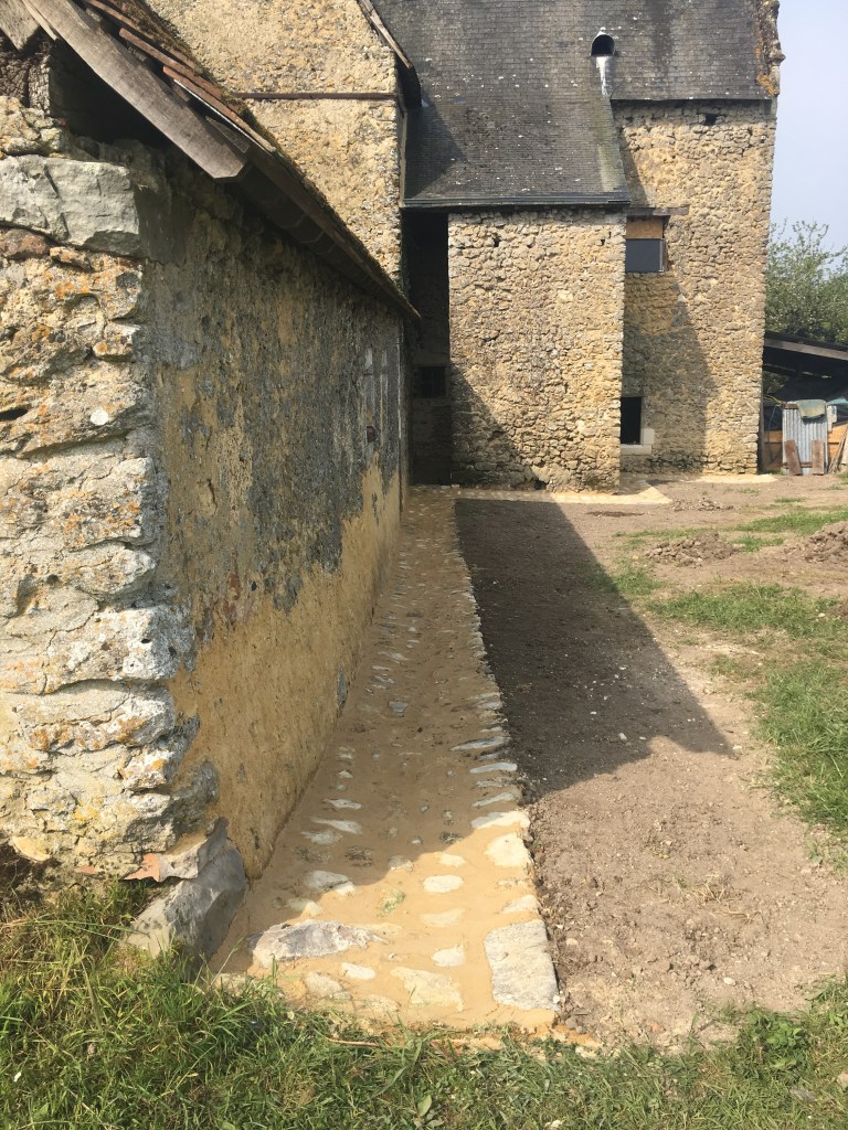 Tout le bas de mur est bien rejointoyer et enduit pour éviter les dégats des éclaboussures en attendant les travaux sur le caniveau (plus bas) et sur la réfection de la toiture qui écartera un peu plus la retombée des eaux de pluie du toit.