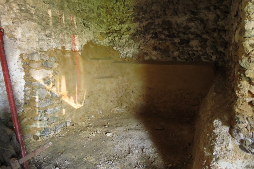 Côté chambre la porte est totalement murée et recouverte d’un enduit. Sous la peinture, on distingue cependant l’ébrasement sous un arc segmentaire appareillé. On distingue également les traces d’un ostevent sur le mur ouest