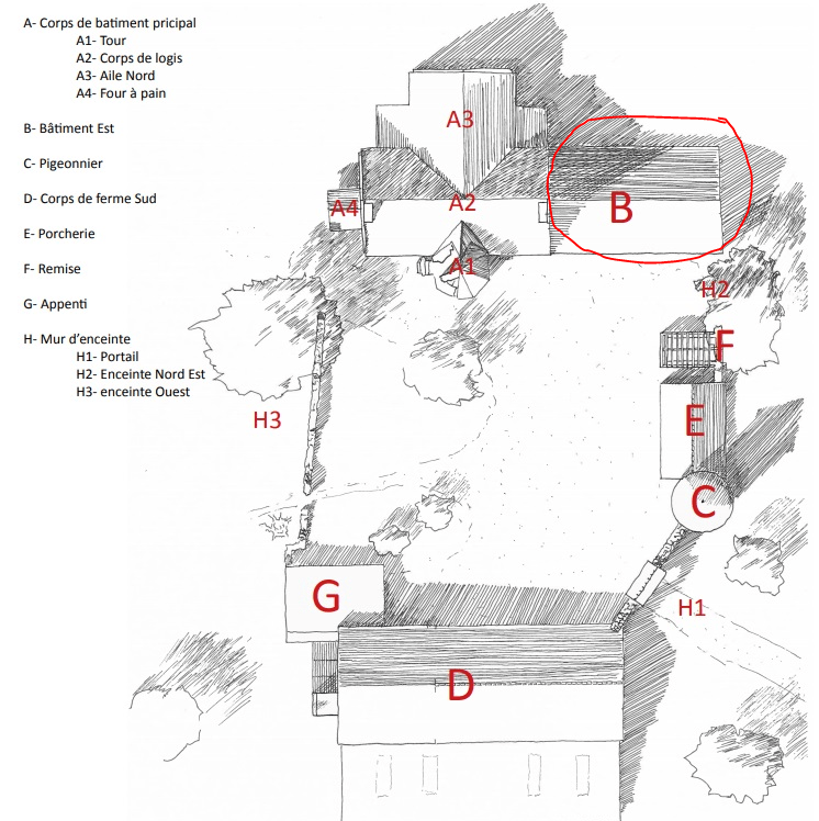Le pignon oriental de l’aile Est a perdu son étage au début du XIXe siècle et l’étude intérieure a montré que le mur a été démoli pour être mis en forme de pignon triangulaire, les rives ayant été reconstruites alors.