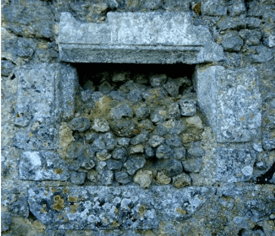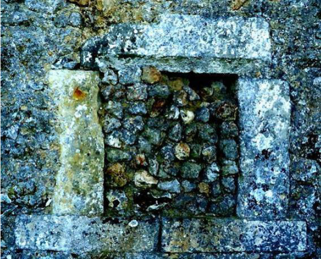 Sur le mur Est, une fenêtre . Elle est encadrée à l’extérieur de pierre calcaire semi dure de Nuillé décorée d’une arête chanfreinée. Le linteau et le rebord sont monolithes.